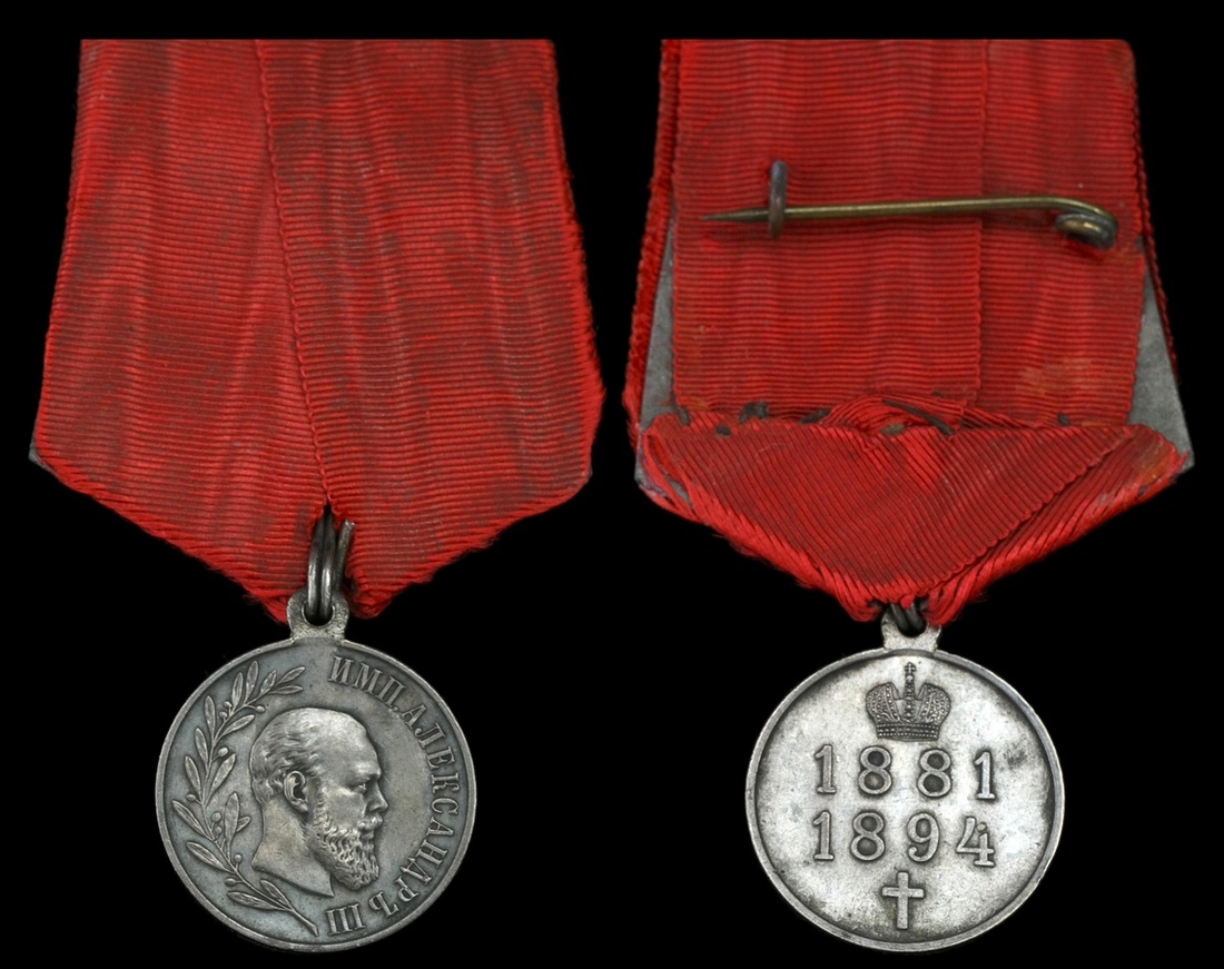 Russia. Award Medal in Memory of Alexander III, 1894. Silver, 27.6mm. Head right, branch behind; reign dates, crown above, memorial cross below. Diakov 1094.1. On original ribbon. Toned. Extremely Fine.