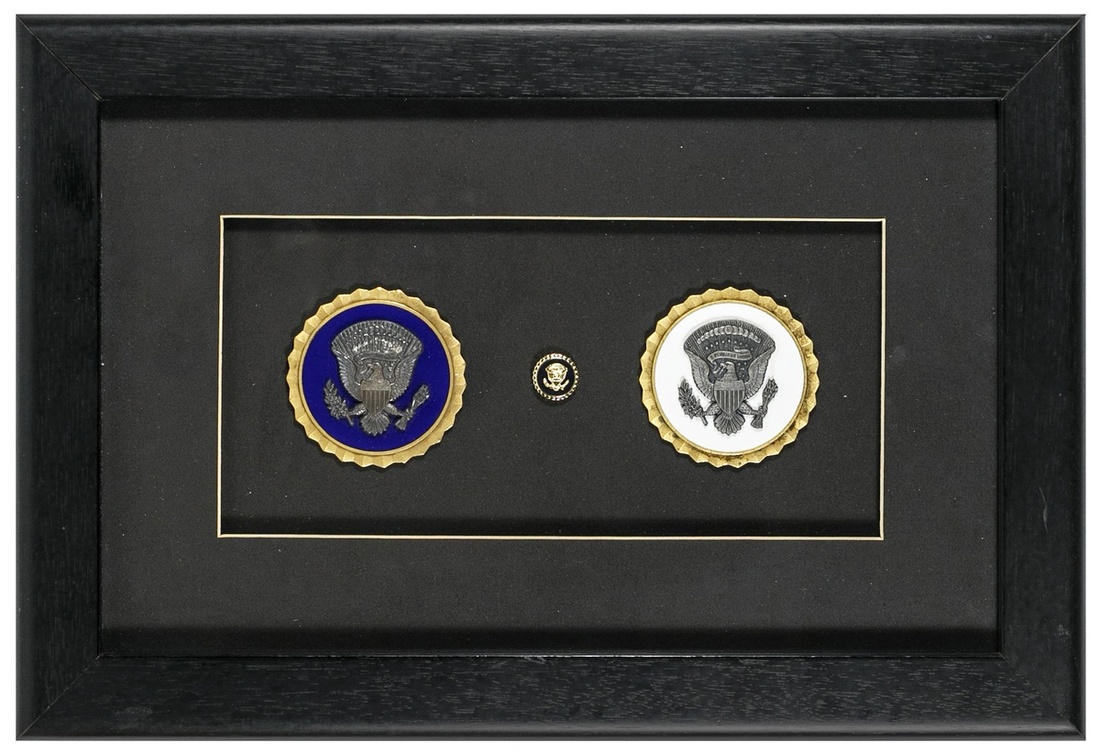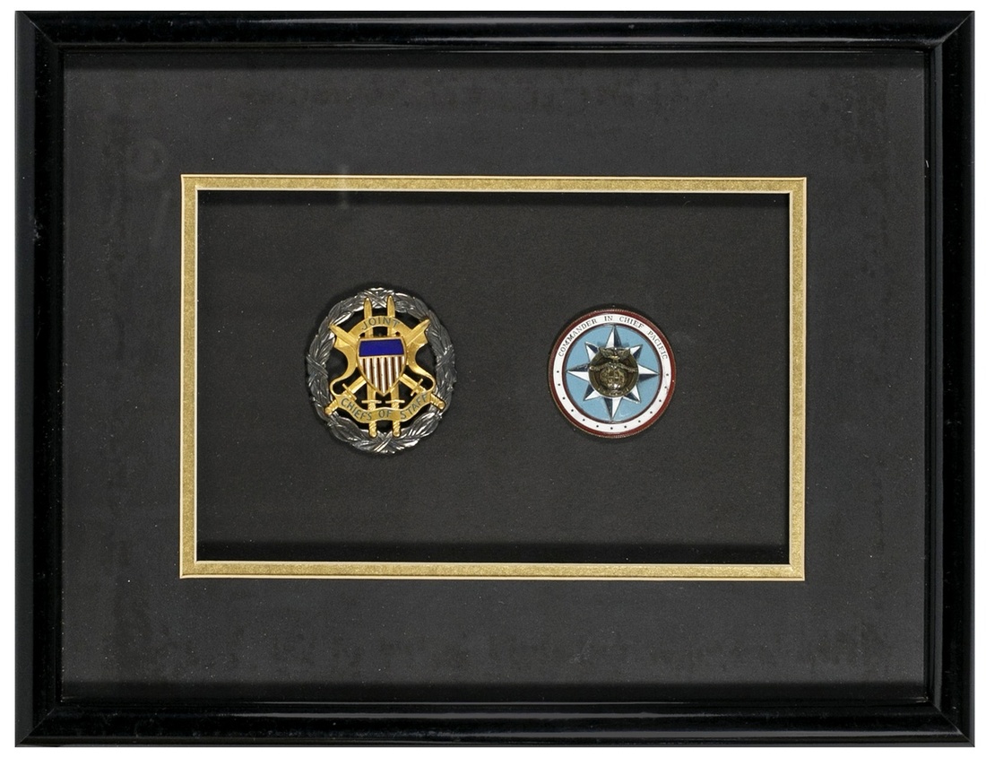 U.S. Group of Armed Forces Identification Badges: Joint Chiefs of Staff; Navy Commander in Chief Pacific; Secretary of Defense and Army General Chief Staff; and Presidential or Former White House Service Badges - no stars, blue background, and white background. Attractively framed in pairs.