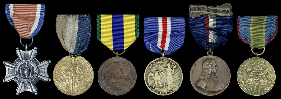 U.S. Lot of Mexico Service and State-issued Service medals. Includes: Marine Corps. Mexico Service 1911-1917, unnumbered; NY State Mexico Border Service 1916-1917; Pennsylvania Mexico Border Service 1916 with bar; Connecticut WWI, 1917-1918 Service; NY State Conspicuous Service Cross. Silver. No. 9769. In original case; also Birmingham, England, 1919 Peace Celebration medal. All on ribbons. Extremely Fine. (6)