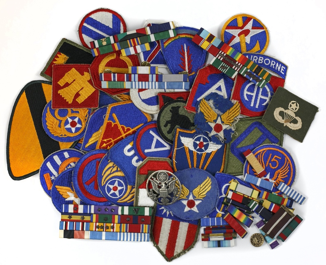 U.S. large group of military cloth insignia and ribbon bars. WWII-modern. Cloth insignia (80), generally Army and Air Force, with a goodly number of ribbon bars. Well-preserved.