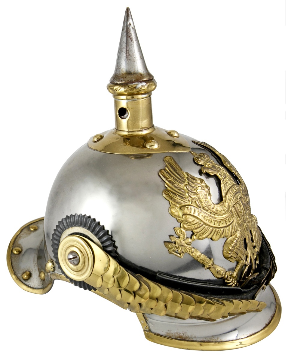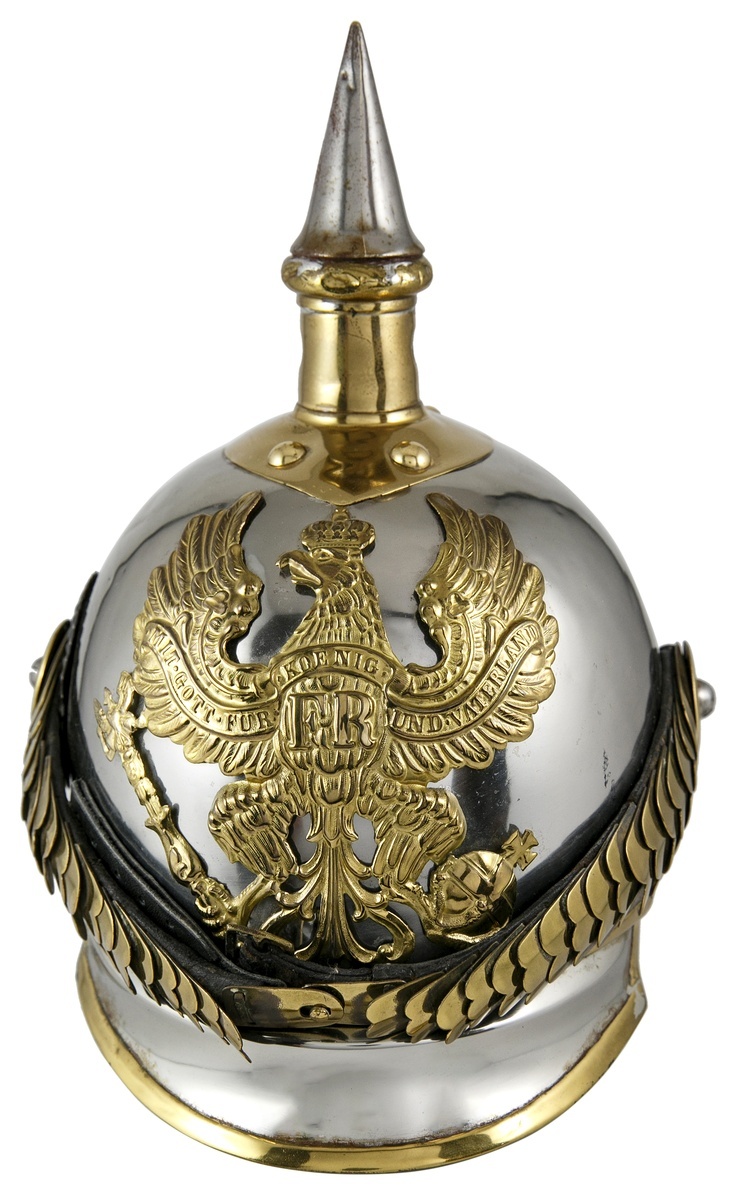 Germany. An 1867-pattern Prussian Cuirassier 'Metalhelme'. Steel skull with brass fixtures and fittings, black leather chinstrap with brass scales, black and white cockade to right hand side, black leather lining, top spike permanently secured to its' base. Possibly a re-constituted example or good-quality reproduction. Good Very Fine.