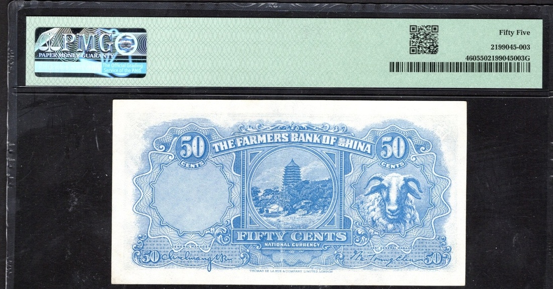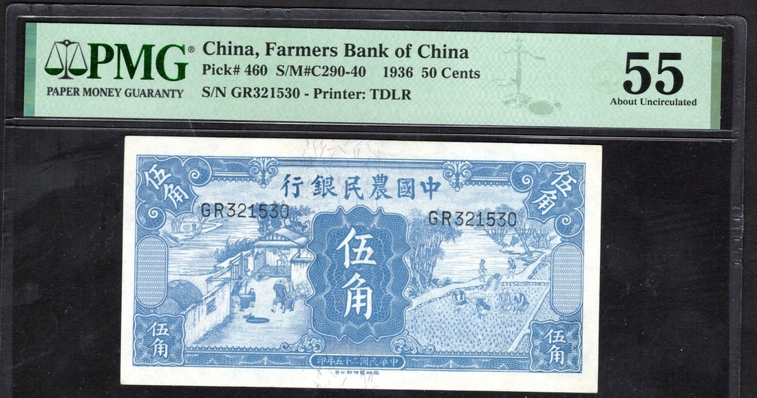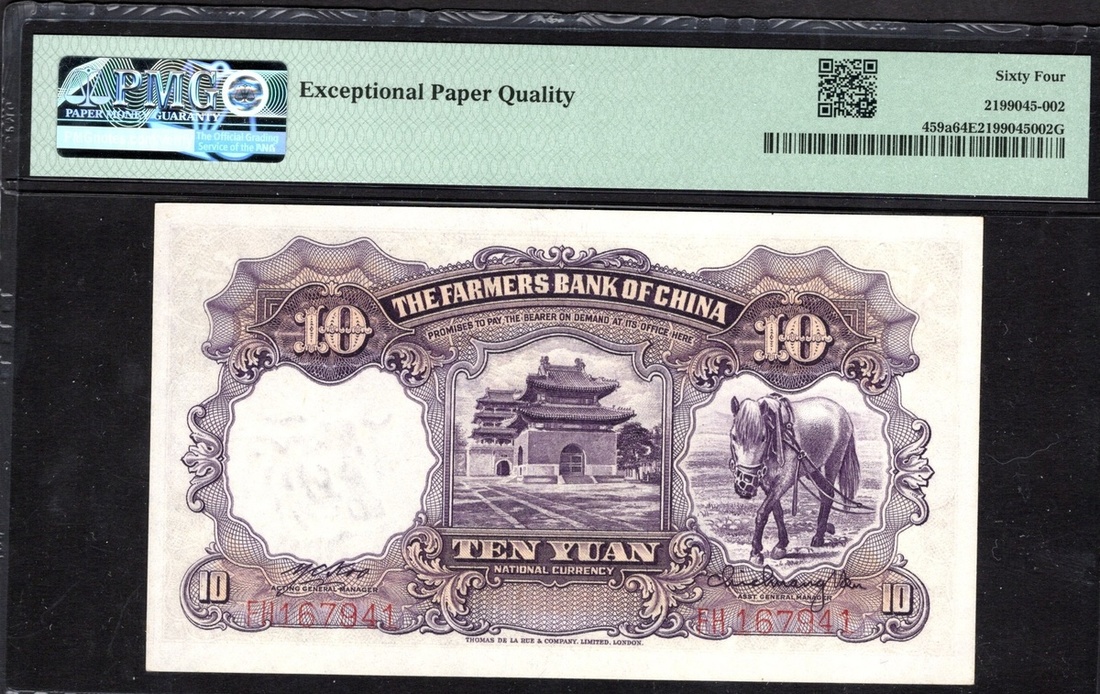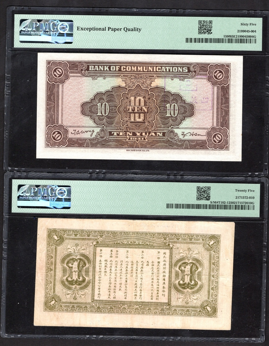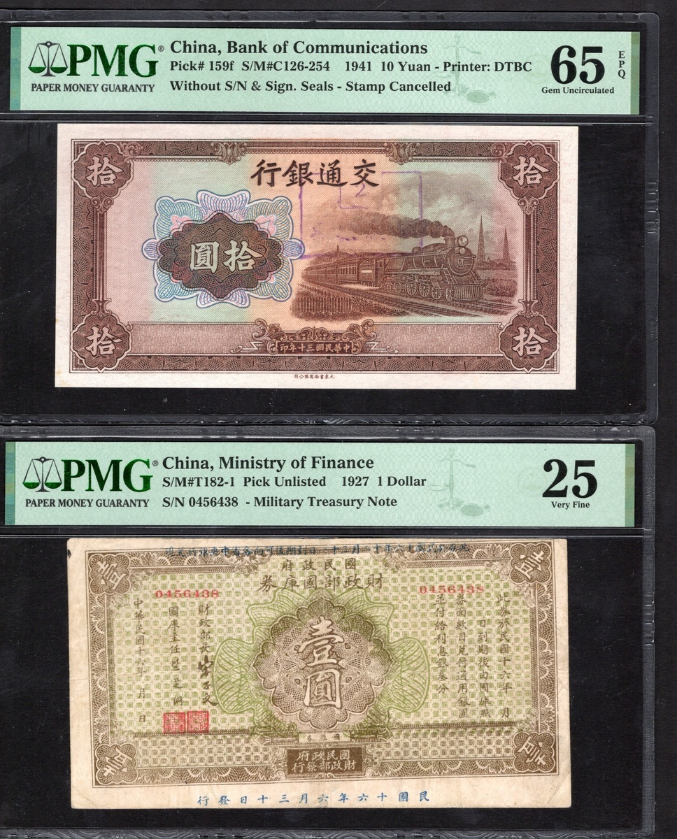 China. Graded Group of Banknotes: Ministry of Finance. Military Treasury Note. 1 Dollar. 1927. Pick--, S/M T182-1. PMG Very Fine 25; Farmers Bank of China. 50 Cents. 1936. P-460. PMG About Uncirculated 55; 10 Yuan. 1935. P-459a. PMG Choice Uncirculated 64 EPQ; Bank of Communications. 10 Yuan 1935. P-155. PMG About Uncirculated 55, minor stains; and 1941. P-159f. PMG Gem Uncirculated 65 EPQ. [5]