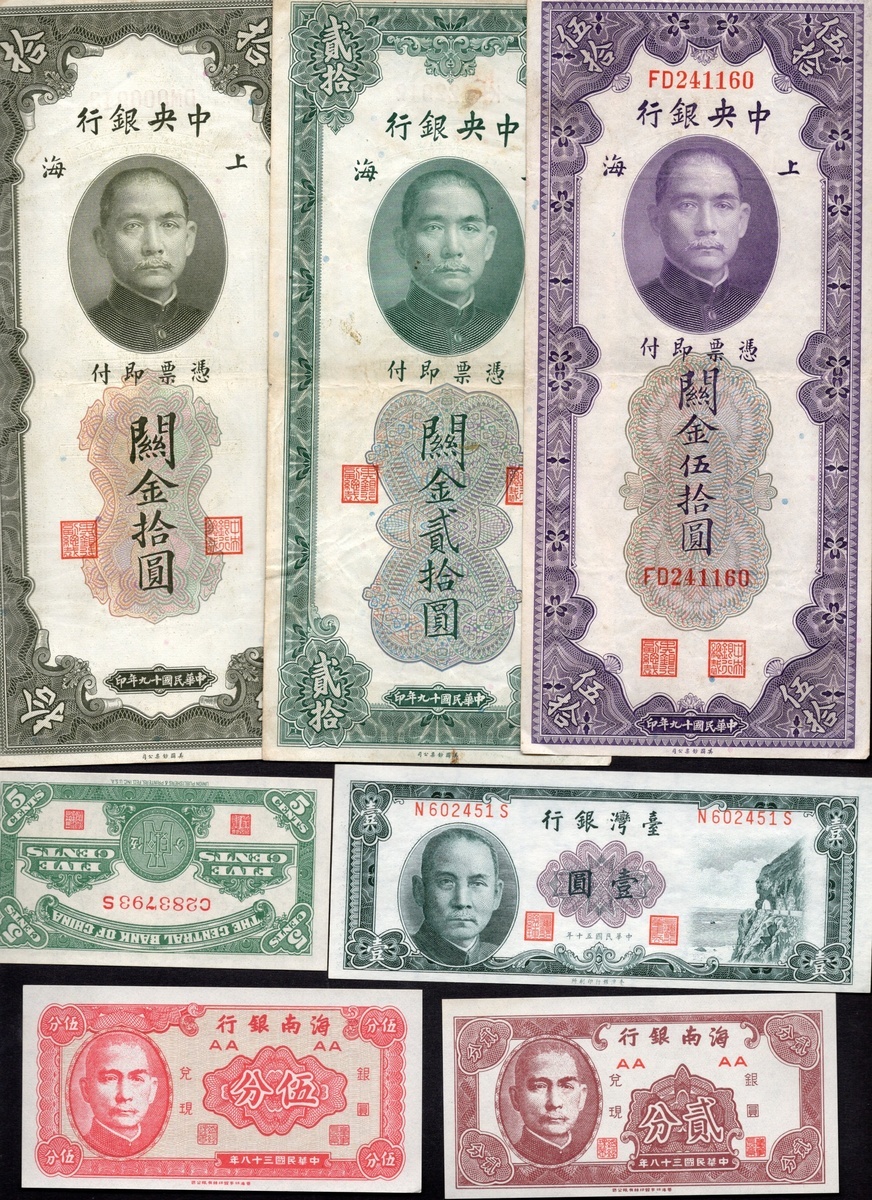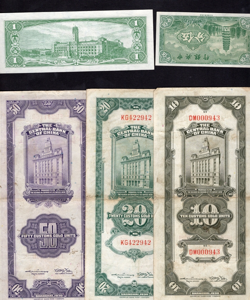 China. Lot of 1930s-1940s Paper Money. Includes: Bank of China. 100 Yuan 1940, others (5); Central Bank of China. 5 Yuan 1930 (4), 5, 10, 100 Yuan 1936, 100 Yuan 1941; 5, 10, 20 and 50 Gold Units 1930; 1000 Yuan 1945, 1 Dollar 1949; others (9). AVG-Unc. (29)