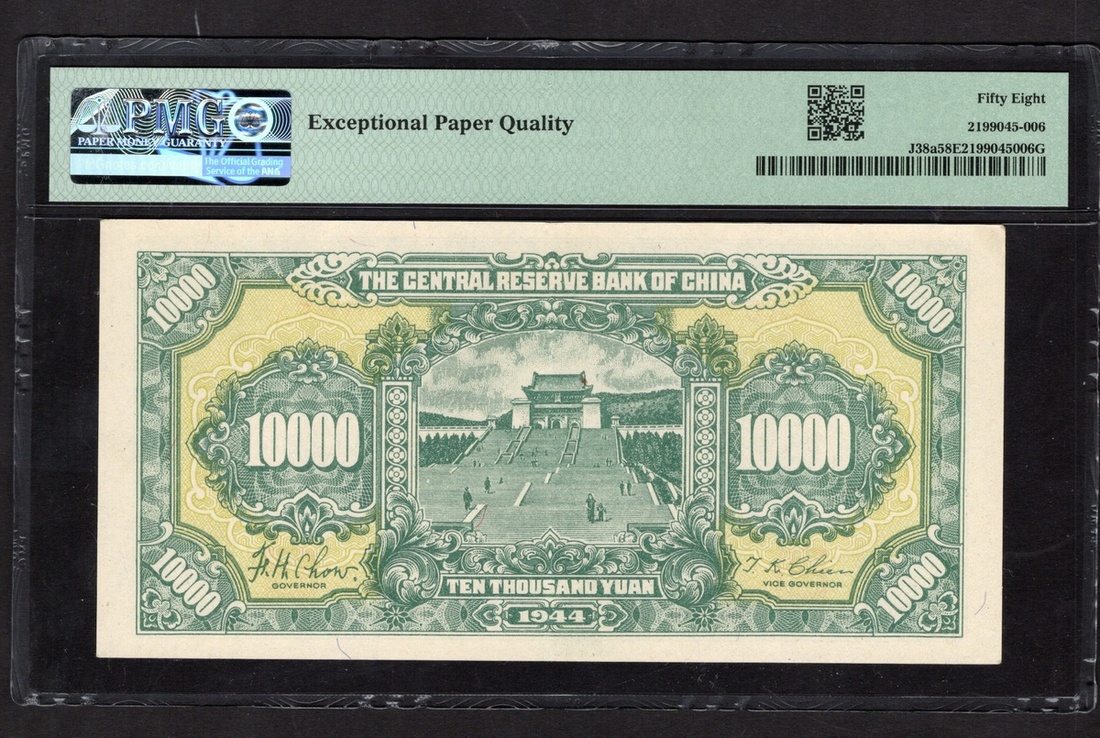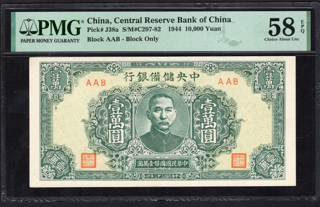 China. Japanese Puppet Banks. Central Reserve Bank of China. 10,000 Yuan. 1944. P-J38a, S/M C297-82. Block: AAB. Green on pale yellow-green. Sun Yat-sen portrait at center; his mausoleum on back. PMG Choice About Unc 58 EPQ.