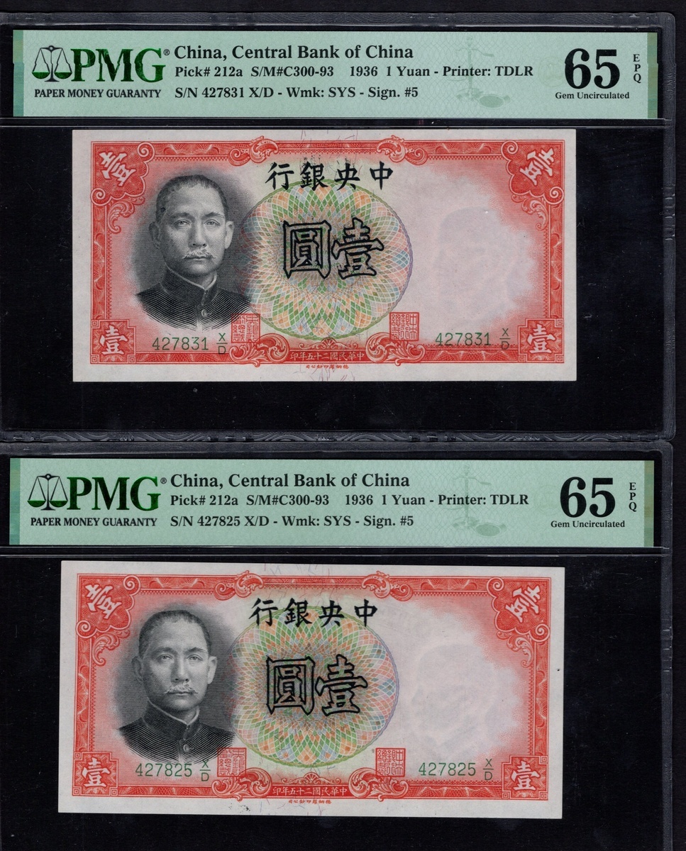 China. Central Bank of China. Quartet of graded 1 Yuan. 1936. P-212a, S/M C300-93. Sun Yat-set at left; Gateway and temple back center. TDLR. PMG Gem Uncirculated 65 EPQ (2), Gem Uncirculated 66 EPQ (2). [4]