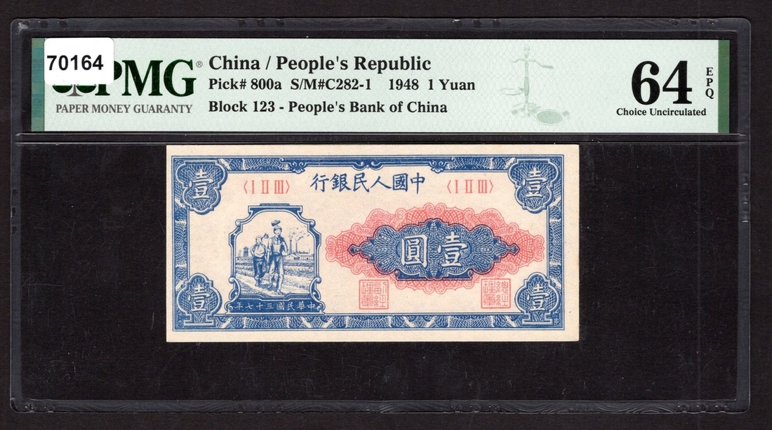China. Peoples Republic. Peoples Bank of China. 1 Yuan. 1948. P-800a. Block 123. Blue and light red, brown back. Two workers in cartouche at left. PMG Choice Uncirculated 64 EPQ.