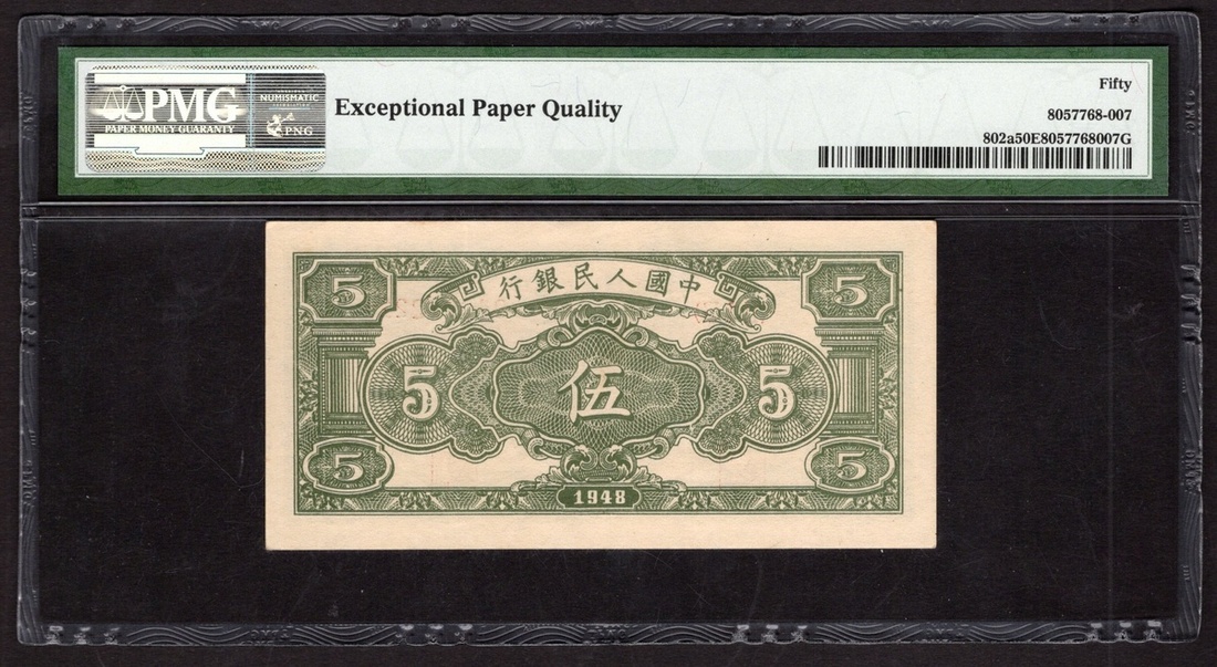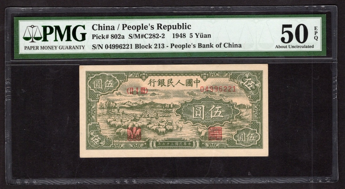 China. Peoples Republic. Peoples Bank of China. 5 Yuan. 1948. P-802a. No. 04996221, block 213. Green. Flock of sheep at left. PMG About Uncirculated 50 EPQ.