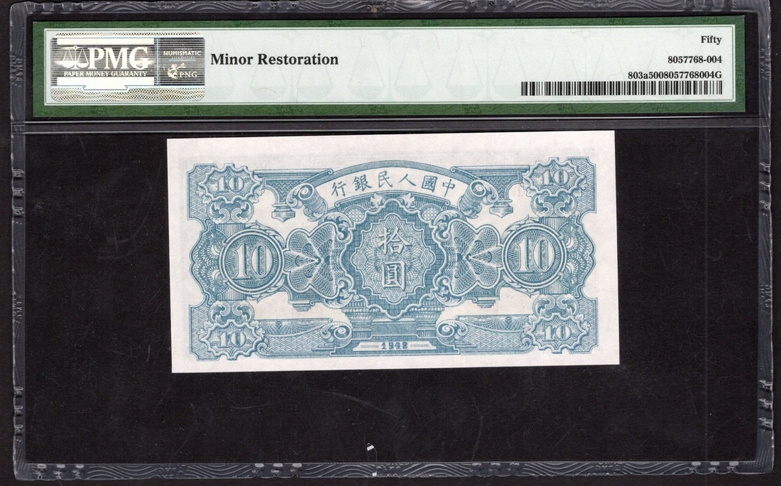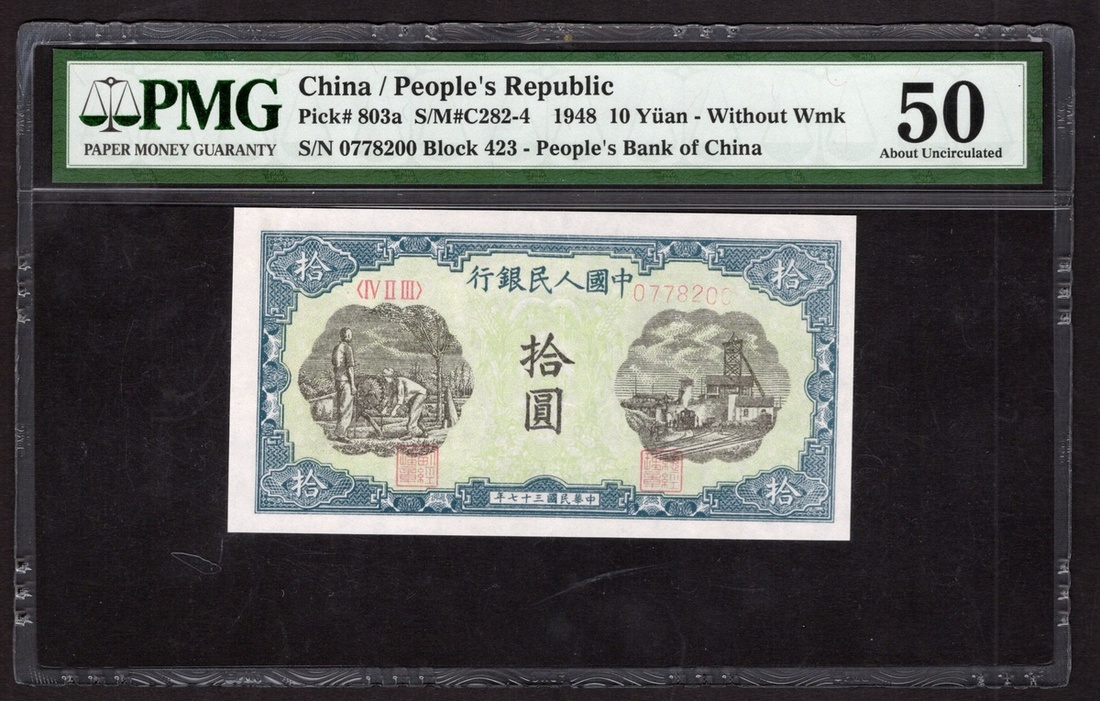 China. Peoples Republic. Peoples Bank of China. 10 Yuan. 1948. P-803a. No. 0778200, block 423. Blue-green and black on light green; light blue back. Farm workers at left, coal mine at right. PMG About Uncirculated 50.