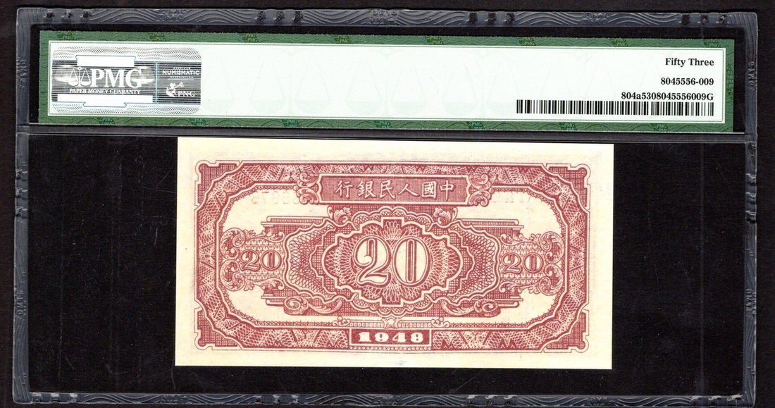 China. Peoples Republic. Peoples Bank of China. 20 Yuan. 1948. P-804a. No. 00589676, block 123. Brown; claret red back. Rural couple at left, passenger train at right. PMG About Uncirculated 53.