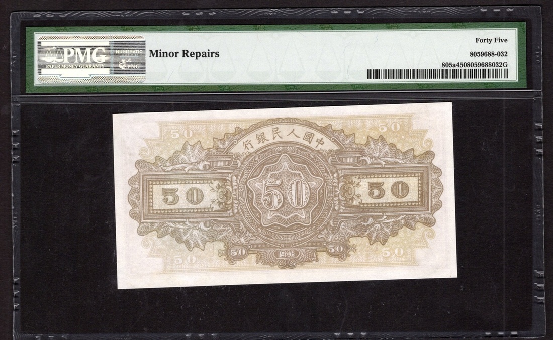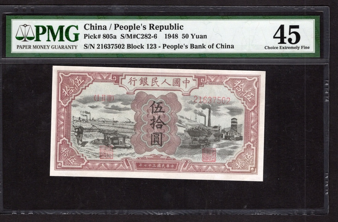 China. Peoples Republic. Peoples Bank of China. 50 Yuan. 1948. P-805a. No. 21637502, block 123. Red-brown and black on light gray-green; brown back. Donkey-operated well at left, coal mine operation at right. PMG Choice Extremely Fine, minor repairs.