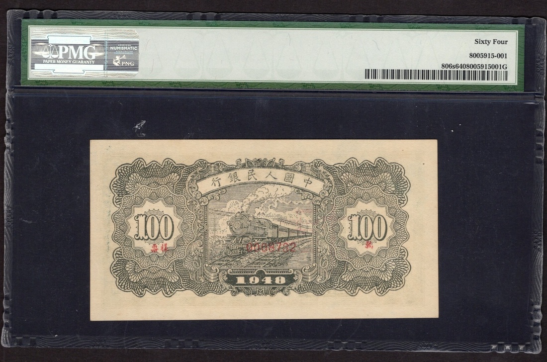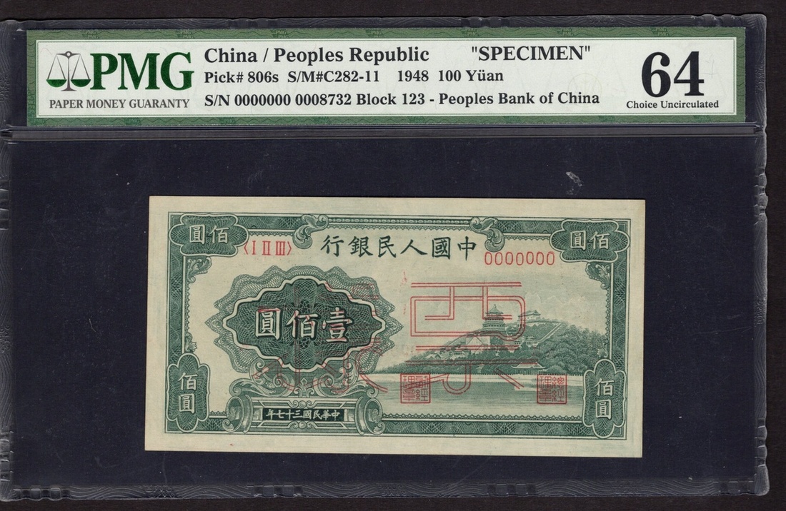 China. Peoples Republic. Peoples Bank of China. Specimen 100 Yuan. 1948. P-806s. No. 0000000/0008732, block 123. Dark green. Hillside pagoda at right; passenger train center back. Large red thin outlined Chinese characters for "Specimen" on front. PMG Choice Uncirculated 64.