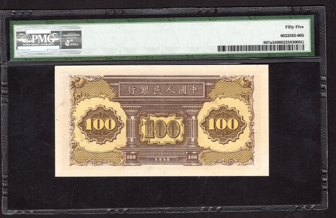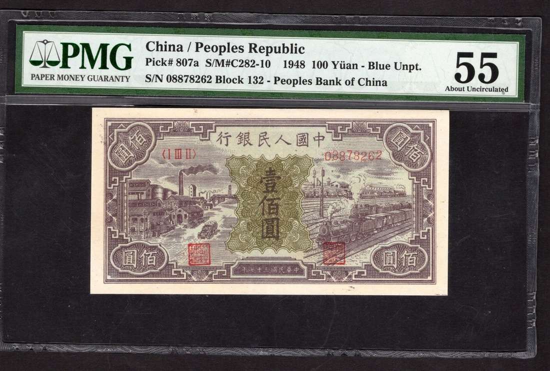 China. Peoples Republic. Peoples Bank of China. 100 Yuan. 1948. P-807a. No. 08878262, block 132. Brown-violet, dark olive-green guilloche on pale blue; brown on light gold back. Factory at left, passenger train right. PMG About Uncirculated 55.