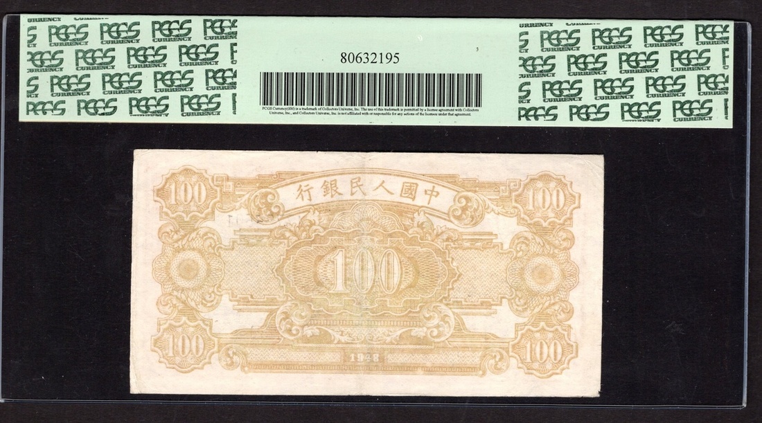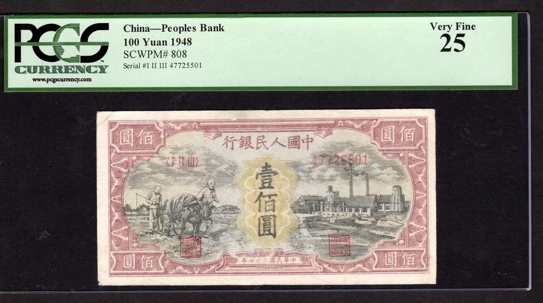 China. Peoples Republic. Peoples Bank of China. 100 Yuan. 1948. P-808. No. 47725501, block 123. Black, carmine, yellow-green guilloche; pale orange-brown back. Farm couple lowing with ox at left, factory at right. PCGS Very Fine 25.