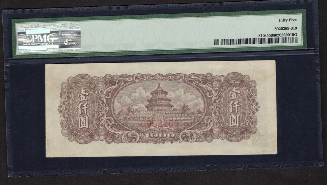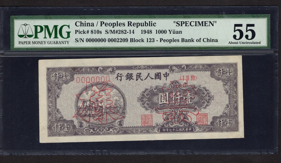 China. Peoples Republic. Peoples Bank of China. Specimen 1000 Yuan. 1948. P-810s. No. 0000000/0002209, block 123. Gray-violet; brown back. Farmer plowing with a pair of horses at left; Temple of Heaven back center. PMG About Uncirculated 55.