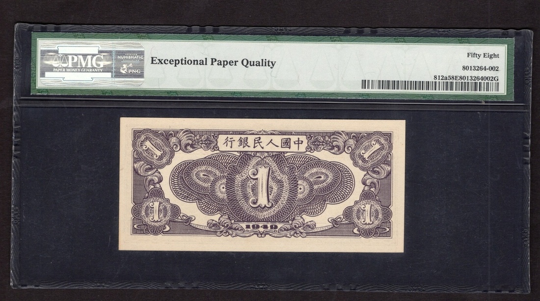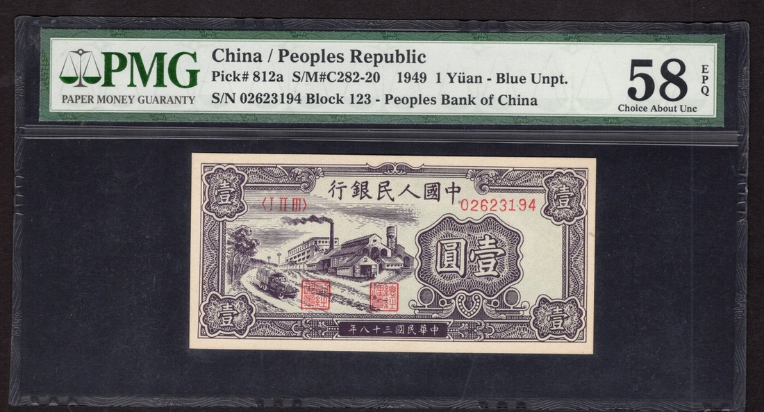 China. Peoples Republic. Peoples Bank of China. 1 Yuan. 1949. P-812a. No. 02623194, block 123. Dark purple on greenish blue. Factory at left. PMG Choice About Unc 58 EPQ.