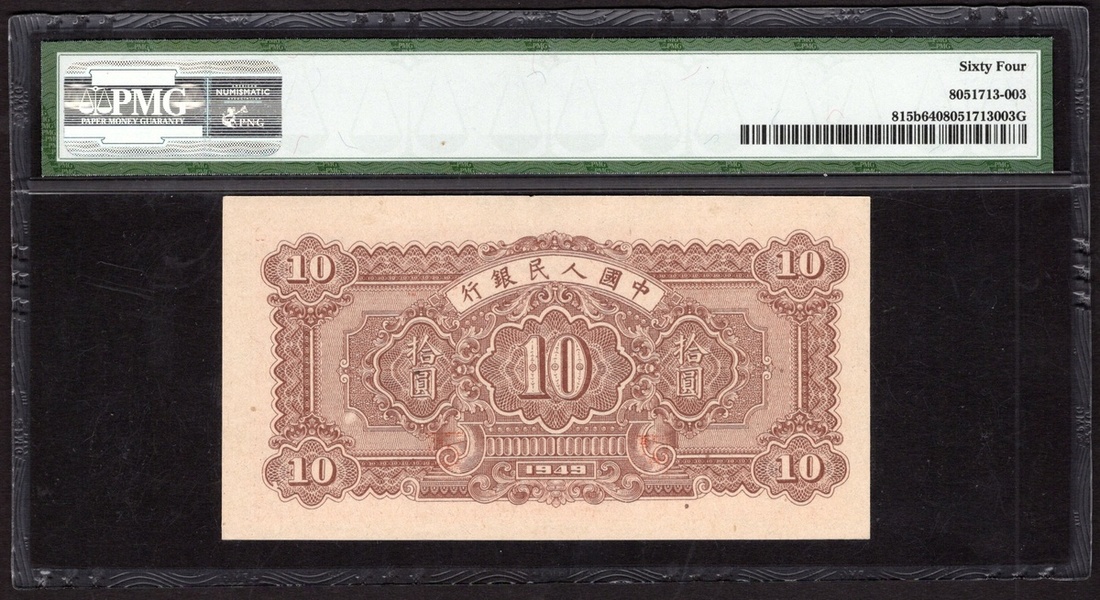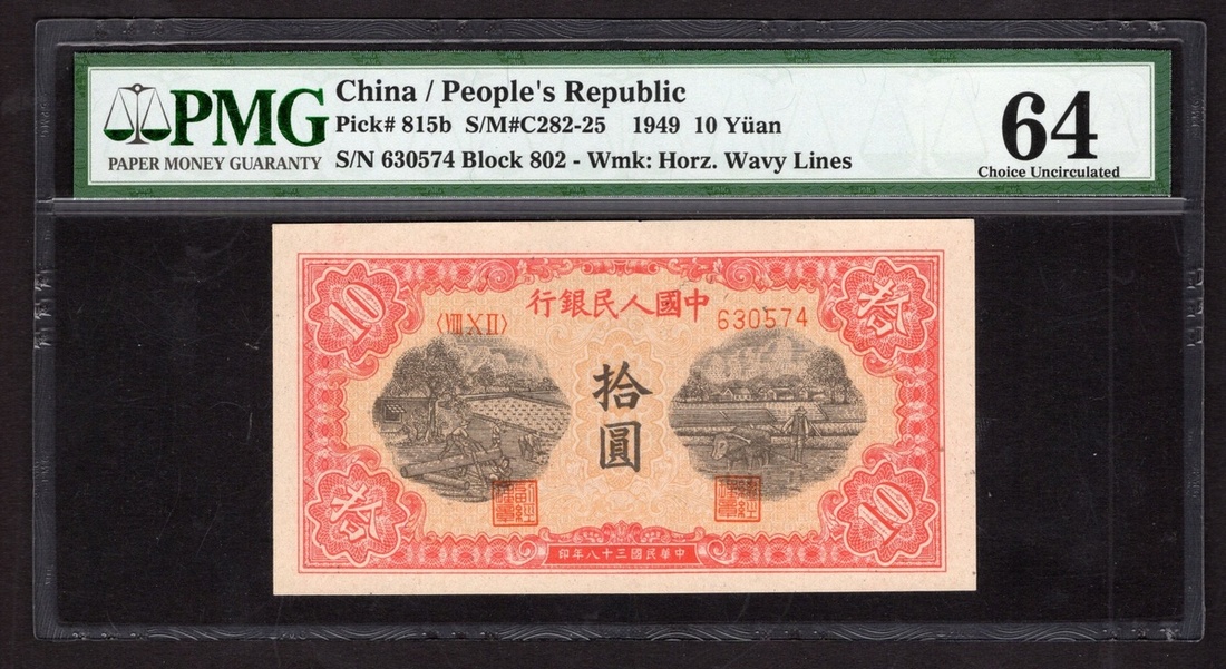 China. Peoples Republic. Peoples Bank of China. 10 Yuan. 1949. P-815B. No. 630574, block 802. Red and black on pink; brown back. Workers in the field at left, farmer plowing with oxen at right. Horizontal wavy line wmk. PMG Choice Uncirculated 64.