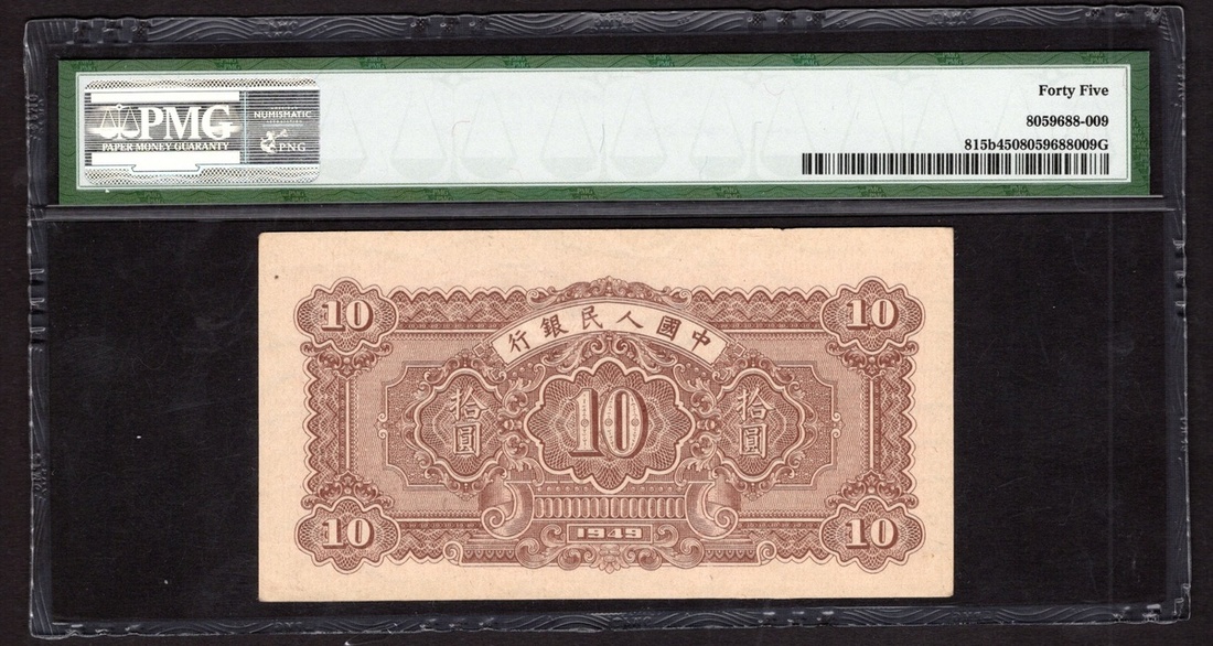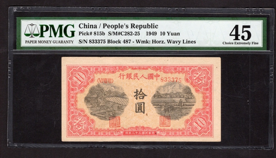 China. Peoples Republic. Peoples Bank of China. 10 Yuan. 1949. P-815B. No. 833375, block 487. Red and black on pink; brown back. Workers in the field at left, farmer plowing with oxen at right. Horizontal wavy line wmk. PMG Choice Extremely Fine 45.