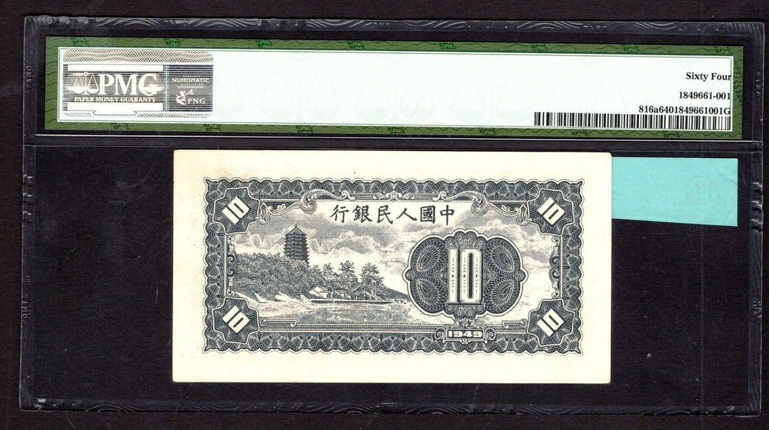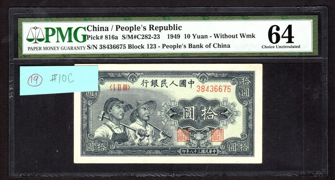 China. Peoples Republic. Peoples Bank of China. 10 Yuan. 1949. P-816a. No. 38436675, block 123. Grayish-blue on green. Farmer and worker at left. PMG Choice Uncirculated 64.