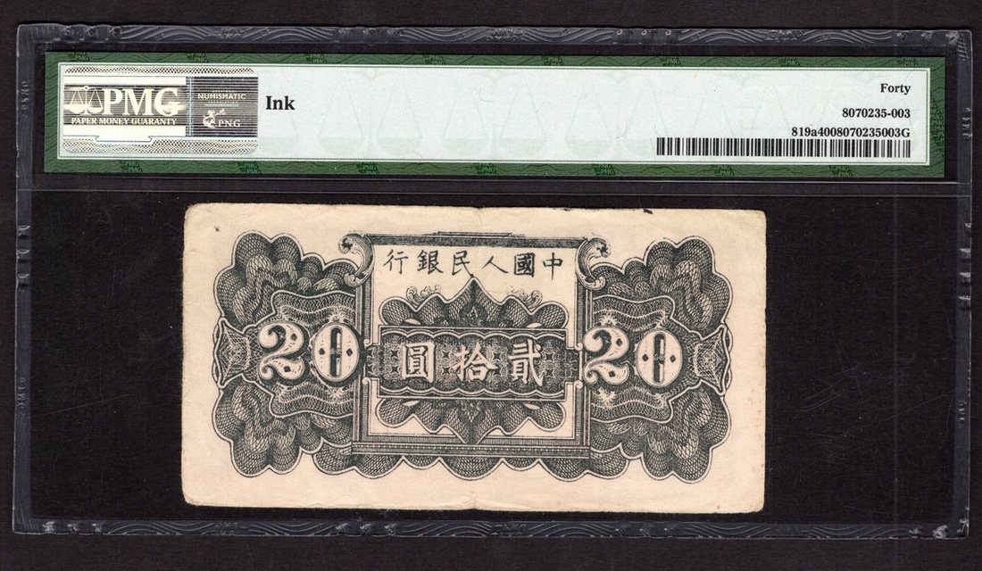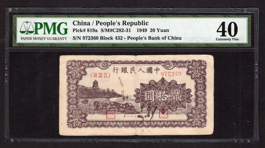 China. Peoples Republic. Peoples Bank of China. 20 Yuan. 1949. P-819a. No. 972360, block 432. Lilac brown; black back. Pagoda at shoreline. A scarce note from the popular 1949 series. PMG Extremely Fine 40, ink.