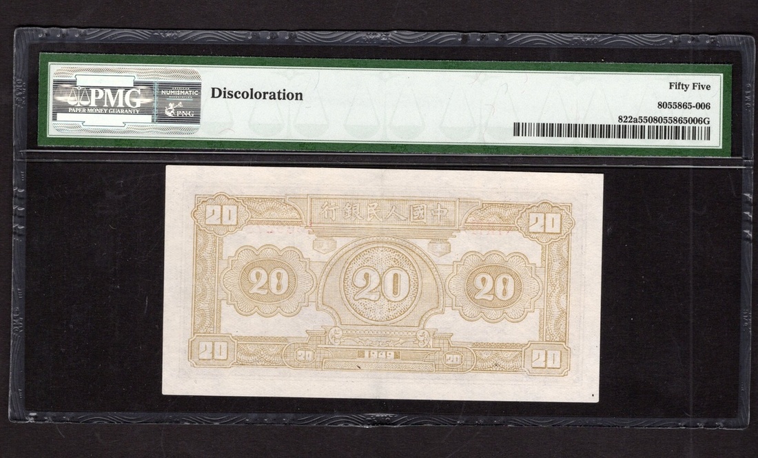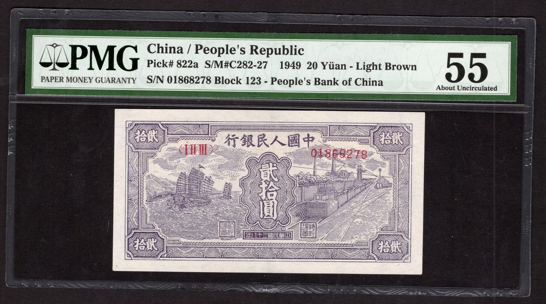 China. Peoples Republic. Peoples Bank of China. 20 Yuan. 1949. P-822a. No. 01868278, block 123. Violet. Junks at sail at left, coal mine at right. PMG About Uncirculated 55, [mild] discoloration.