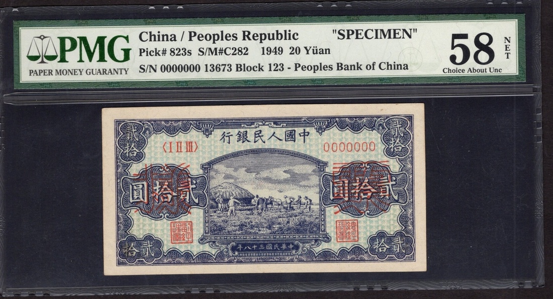 China. Peoples Republic. Peoples Bank of China. Front and Back Specimen 20 Yuan. 1949. P-823fs. No. 0000000/13673, block 123. Blue on light blue-green. Farm workers in field center cartouche. Front - PMG Choice About Unc Net 58, thinning; back - PMG Choice Uncirculated 64.