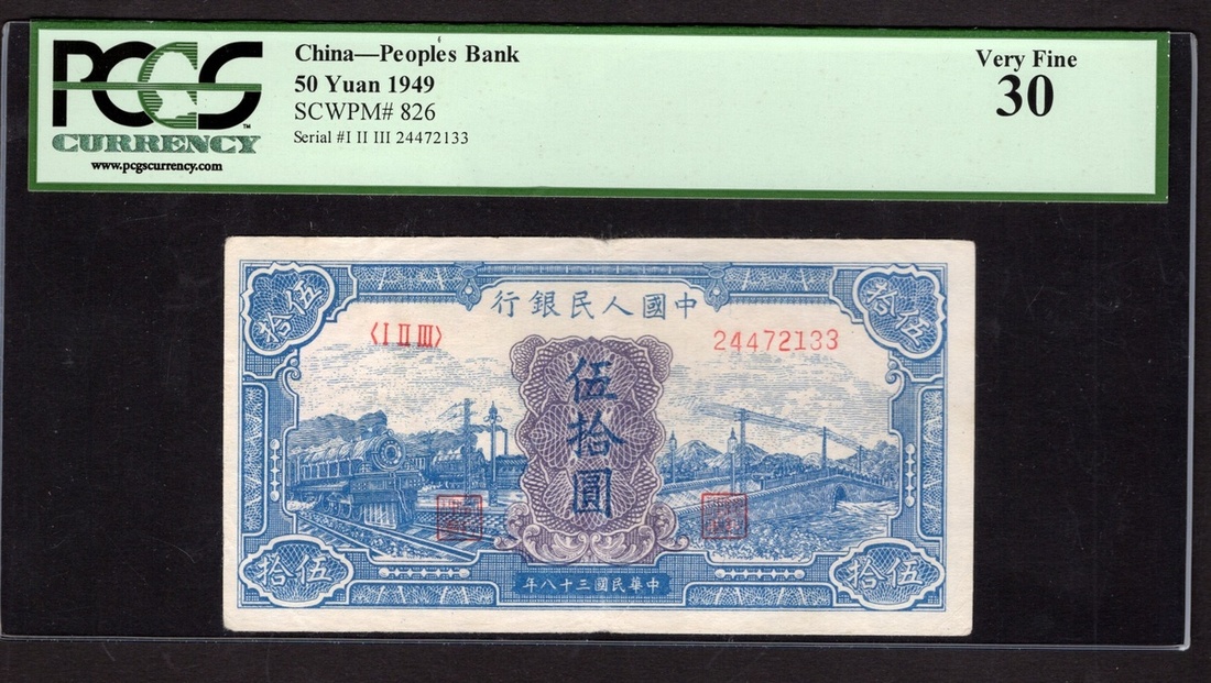 China. Peoples Republic. Peoples Bank of China. 50 Yuan. 1949. P-826. No. 24472133, block 123. Dark blue with purple guilloche; red back. Steam passenger train at left, bridge at right; Truck on road center back. PCGS Very Fine 30.