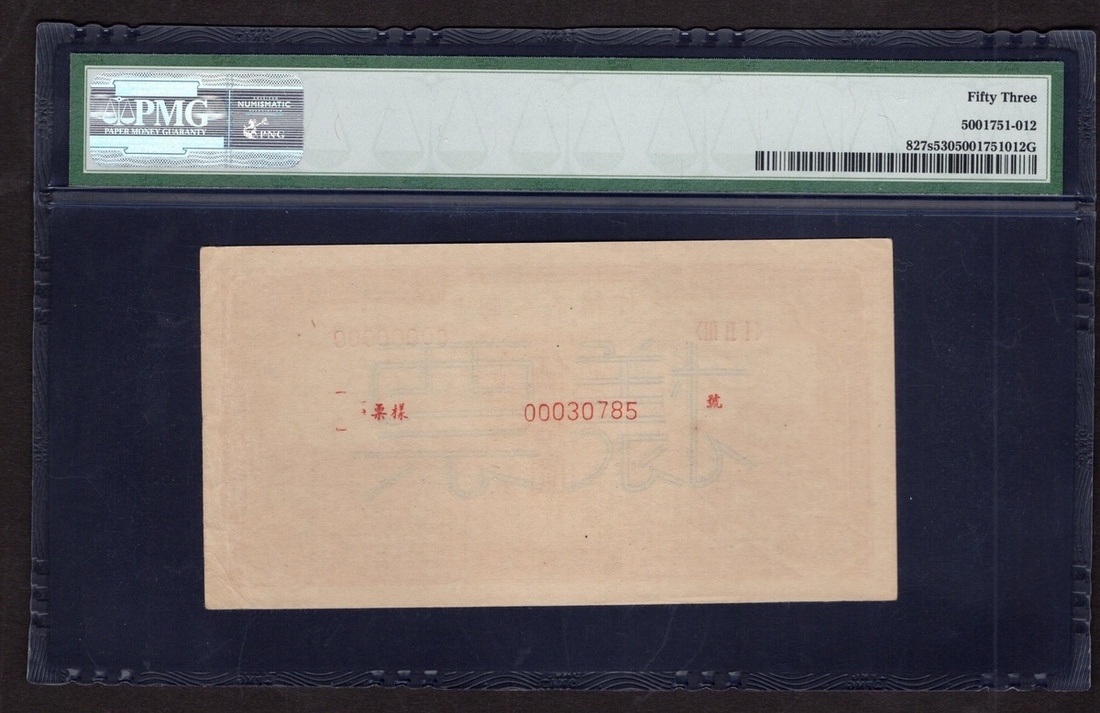 China. Peoples Republic. Peoples Bank of China. Front Specimen 50 Yuan. 1949. P-827fs. No. 00000000/00030785, block 123. Red with orange guilloche. Steam passenger train at left, bridge at right. Large black outlined Chinese characters for "Specimen". PMG About Uncirculated 53.
