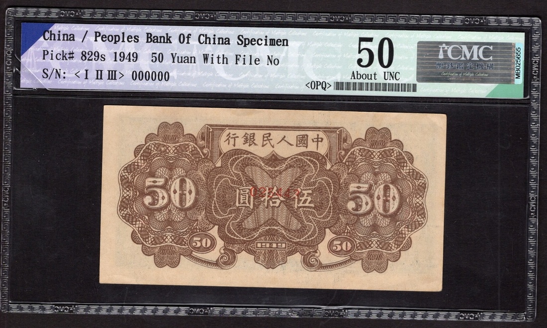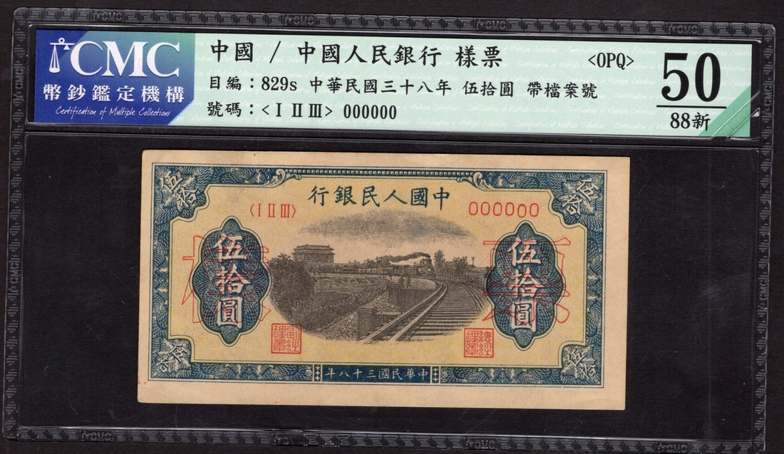 China. Peoples Republic. Peoples Bank of China. Specimen 50 Yuan. 1949. P-829s. No. 00000/025443, block 123. Dark blue and black; brown back. Passenger train rounding the bend at center. CMC About Unc 50.