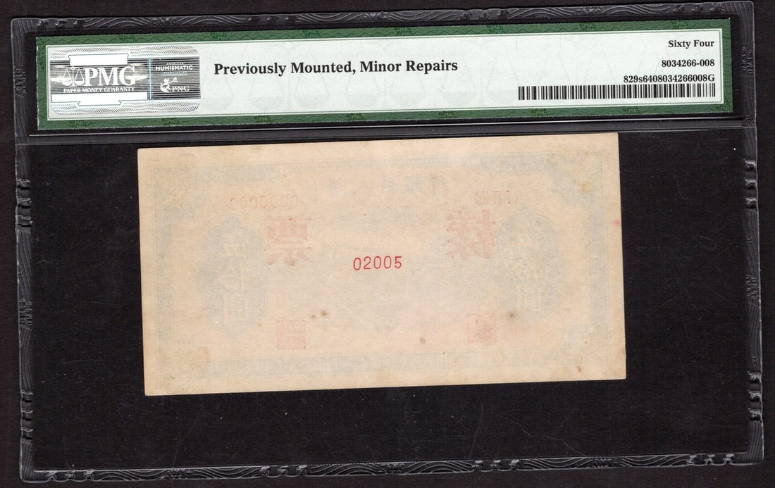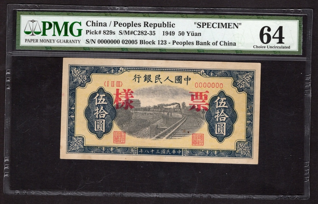 China. Peoples Republic. Peoples Bank of China. Front Specimen 50 Yuan. 1949. P-829fs. No. 0000000/02005, block 123. Dark blue and black on light yellow; brown back. Passenger train rounding the bend at center. PMG Choice Uncirculated 64; previously mounted, minor repairs.