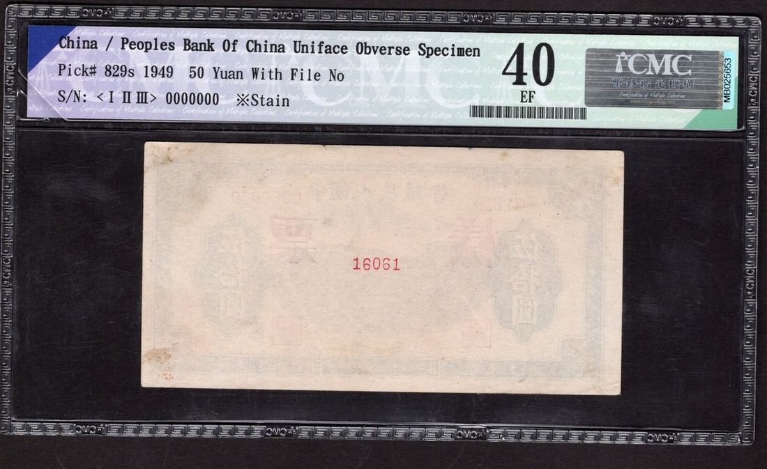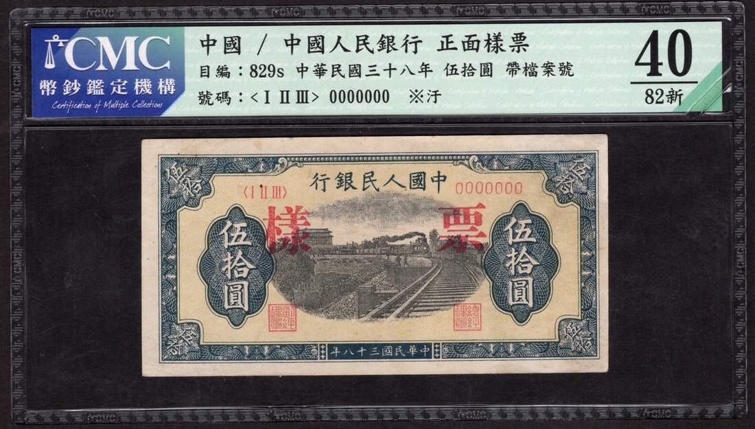 China. Peoples Republic. Peoples Bank of China. Front and Back Specimens - 50 Yuan. 1949. P-829f&bs. No. 0000000/16061, block 123. Dark blue and black on light yellow; brown back. Passenger train rounding the bend at center. Large red Chinese characters for "Specimen". CMC EF 40, stain. [2]