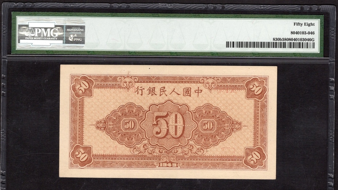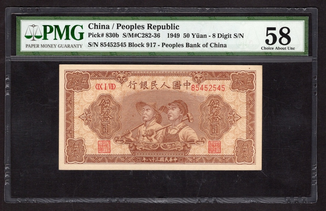 China. Peoples Republic. Peoples Bank of China. 50 Yuan. 1949. P-830b. Eight-digit Serial No. 85452545, block 917. Brown. Farmer and laborer at center. PMG Choice About Unc 58.