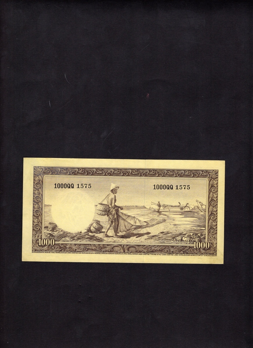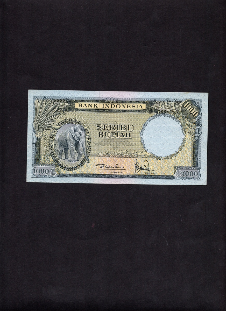 Indonesia. Bank Indonesia. 1000 Rupiah. ND (1957). P-53a. No. 1000QQ 1575. Gray-blue, orange and yellow; brown back. Elephant at left; Fishermen on back. Slight teller handling. AU-Unc.