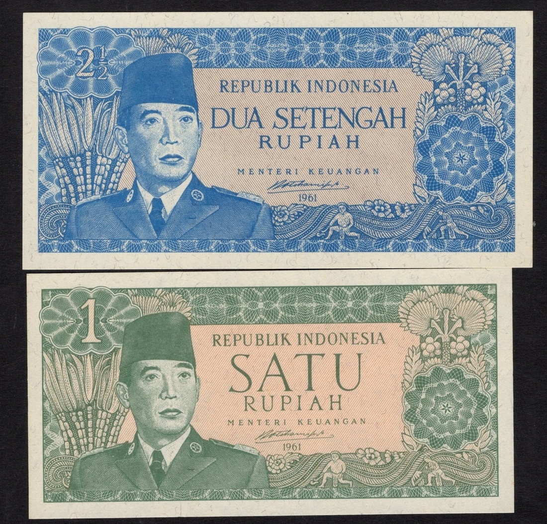Indonesia. Republik Indonesia. Borneo Issue. 1 and 2 ½ Rupiah. 1961. P-79A, 79B. Green on orange; Blue on gray-brown. Sukarno at left; Javanese dancer at right. Crisp Uncirculated. [2]
