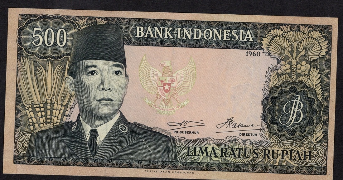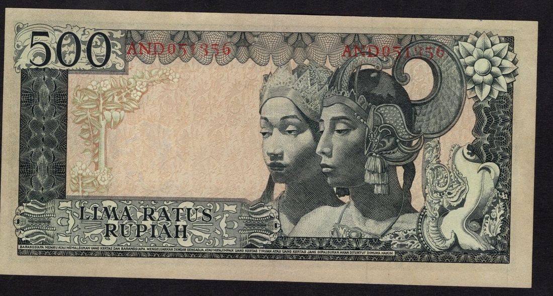 Indonesia. Bank Indonesia. 500 Rupiah. 1960 dated (1964) Issue. P-87c. No. AND 051 356. Black on pale violet, green and yellow. Wmk: buffalo. Sukarno at left; two Javanese dancers back right. Printer: Pertjetakan Kebajoran. Crisp Uncirculated.