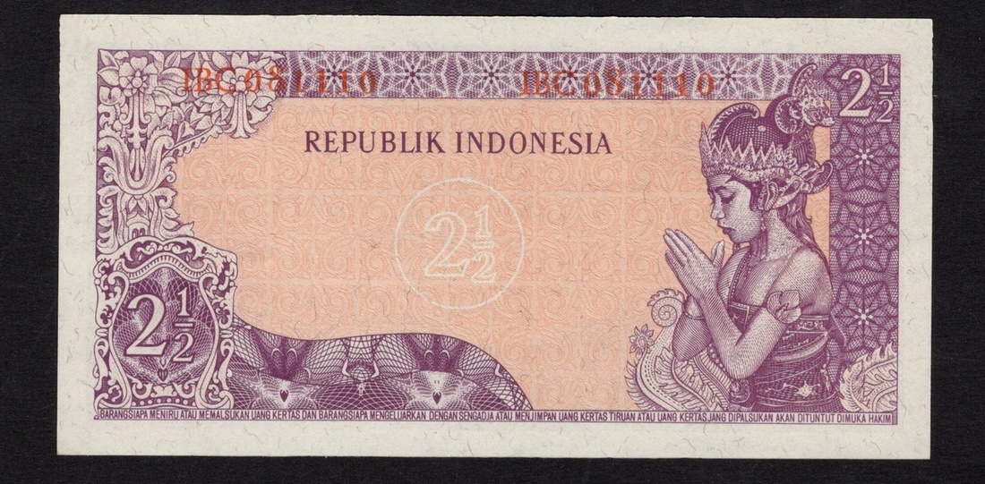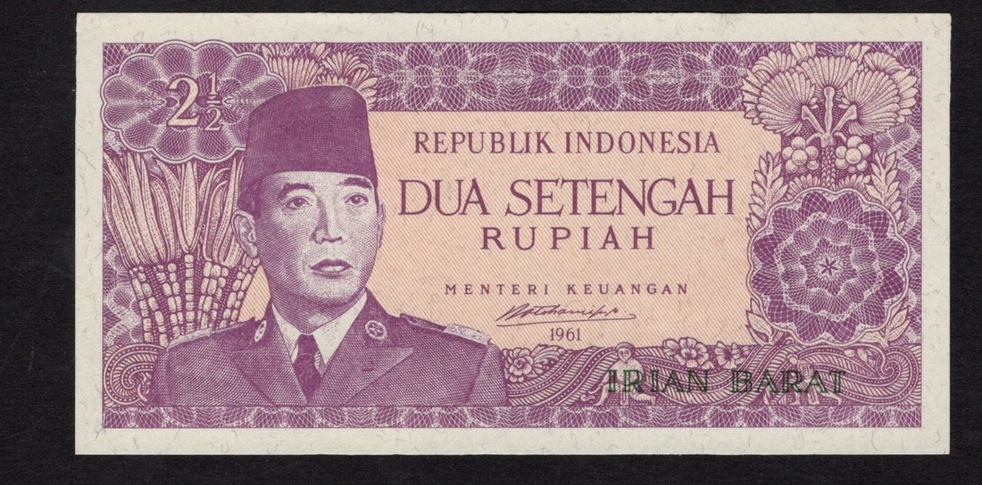 Indonesia. Irian Barat. Republik Indonesia. 2 ½ Rupiah. 1963 Provisional Issue. P-R2. No. IBC 081110. Violet and salmon. Sukarno at left; Ceremonial dancer on back. Crisp Uncirculated.