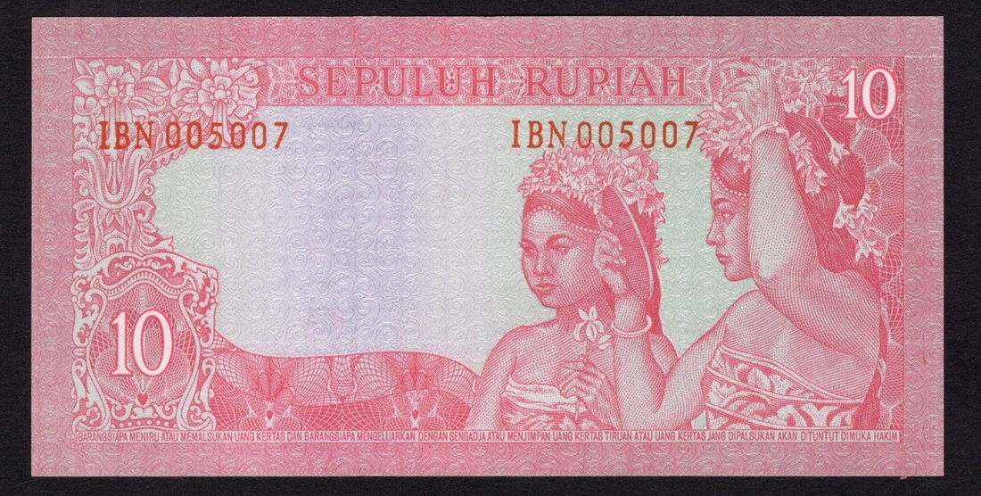 Indonesia. Irian Barat. Bank Indonesia. 10 Rupiah. 1963 Provisional Issue. P-R4. No. IBN 005007. Rose, violet, yellow and green. Sukarno at left with garuda and IRIAN BARAT overprint; two young women on back right. Choice Uncirculated.