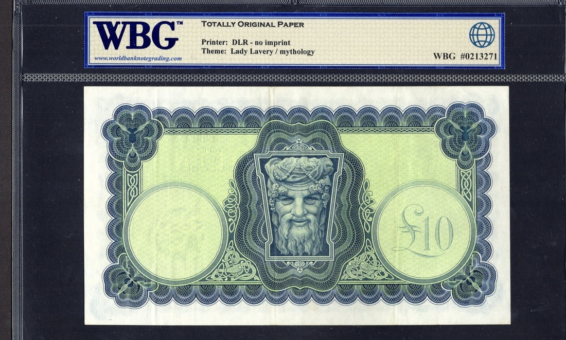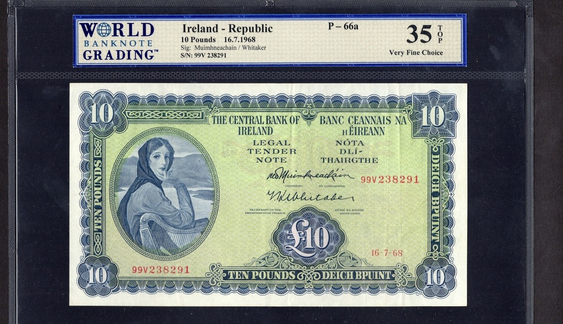 Ireland. Republic. Central Bank. 10 Pounds. 17-7-1968. P-66a. Blue on multicolor. Lady Lavery at left; Celtic river god back center. WBG Very Fine Choice 35 TOP.