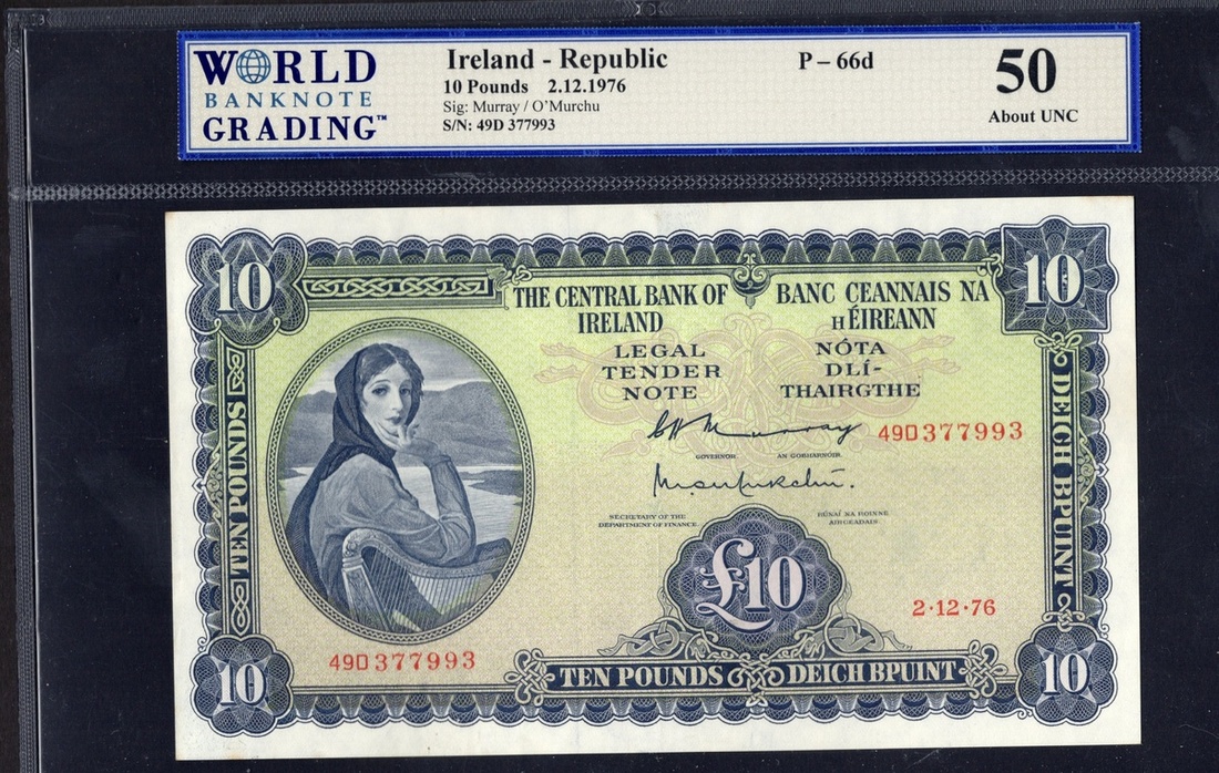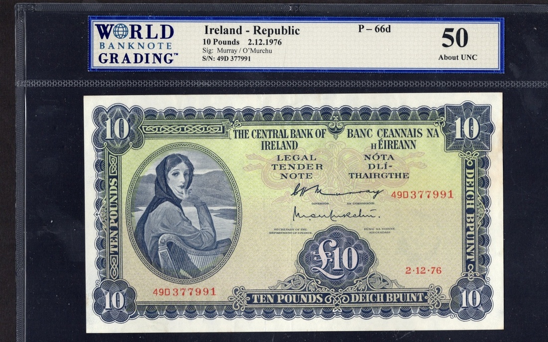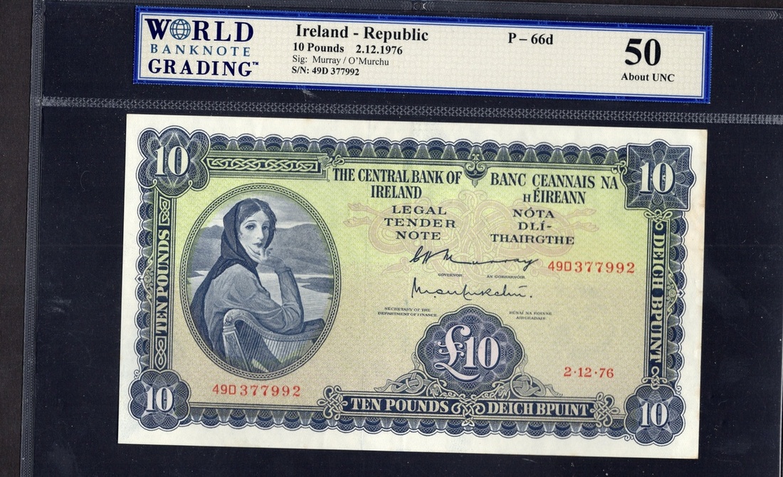 Ireland. Republic. Central Bank. Trio of 10 Pounds. 2-12-1976. P-66d. Consecutive numbers. Blue on multicolor. Lady Lavery at left; Celtic river god back center. All WBG About Unc 50. [3]