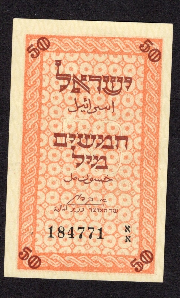 Israel. Israel Government. Fractional Note Issue. 50 Mils. Printed 1948, issued 1952. P-6. Vertical format. alef alef 184771. Dark red and orange. Floor mosaic from the ancient Beit Alpha synagogue. About EF.
