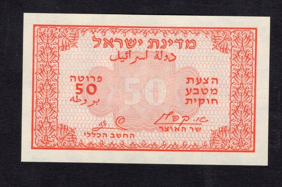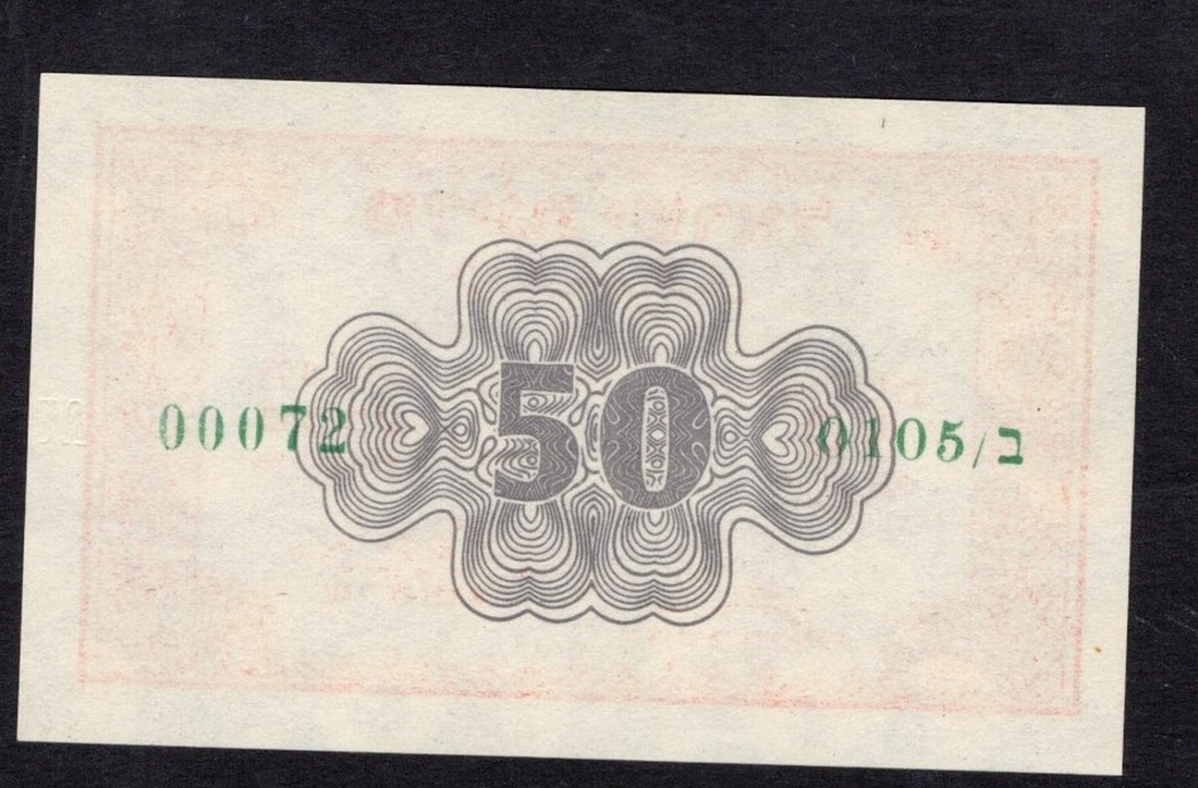 Israel.  Israel Government. Fractional Note Issue. 50 Prutah. ND (1952). P-9. No.00072/ 0105 bet. Signature: Zaggagi-Kaplan. Red on pink; grey guilloche on back.  Uncirculated.