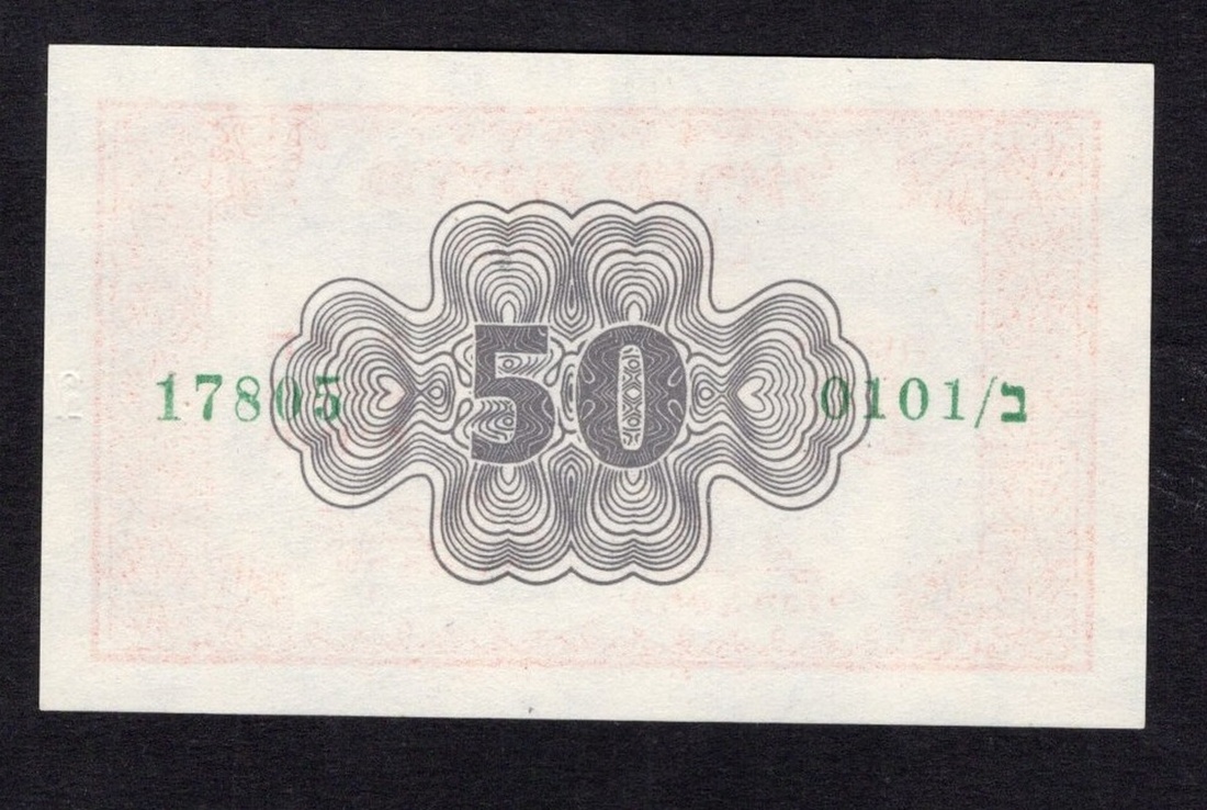 Israel. Israel Government. Fractional Note Issue. 50 Prutah. ND (1952). P-9. No.17805/ 0101 bet. Signature: Zaggagi-Kaplan. Red on pink; grey guilloche on back. AU.