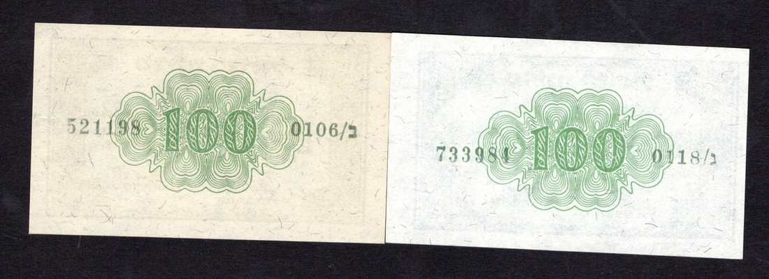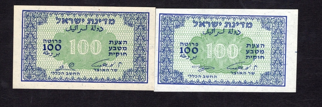 Israel. Israel Government. Fractional Note Issue. Signature variety pair of 100 Prutah. ND (1952). P-12b, c. Signature: Zaggagi-Eshkol; Neeman-Eshkol. Blue on green; green guilloche. Crisp Uncirculated. [2]