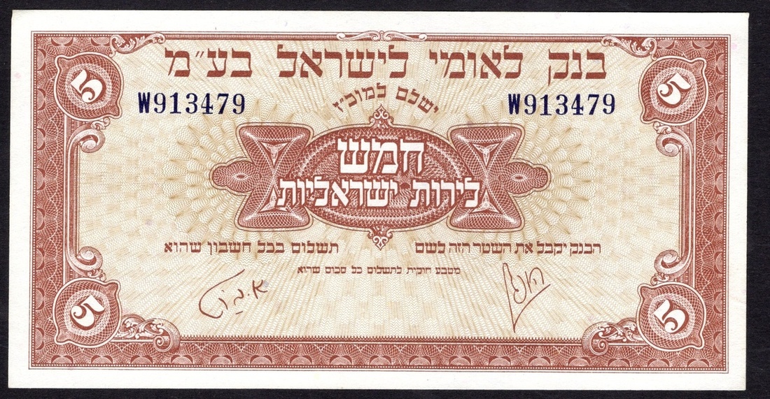 Israel. Bank Leumi Le-Israel B.M. 5 Pounds. ND (1952). P-21a. No. W913479. Reddish-brown on yellow-tan. ABNC. Uncirculated.