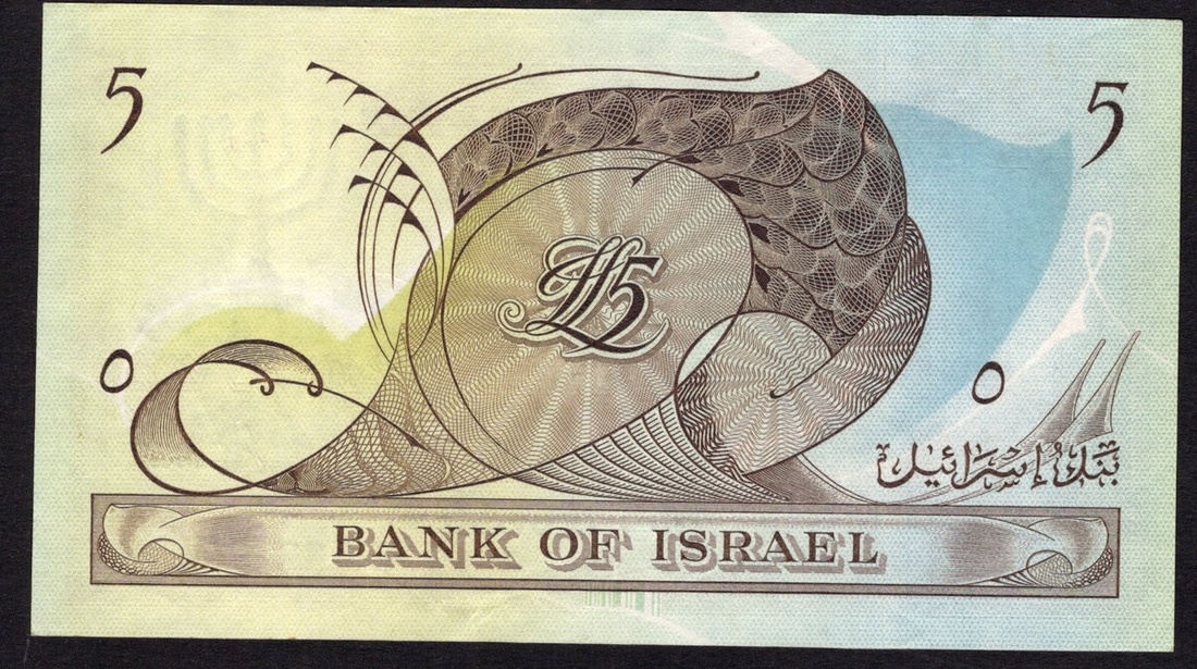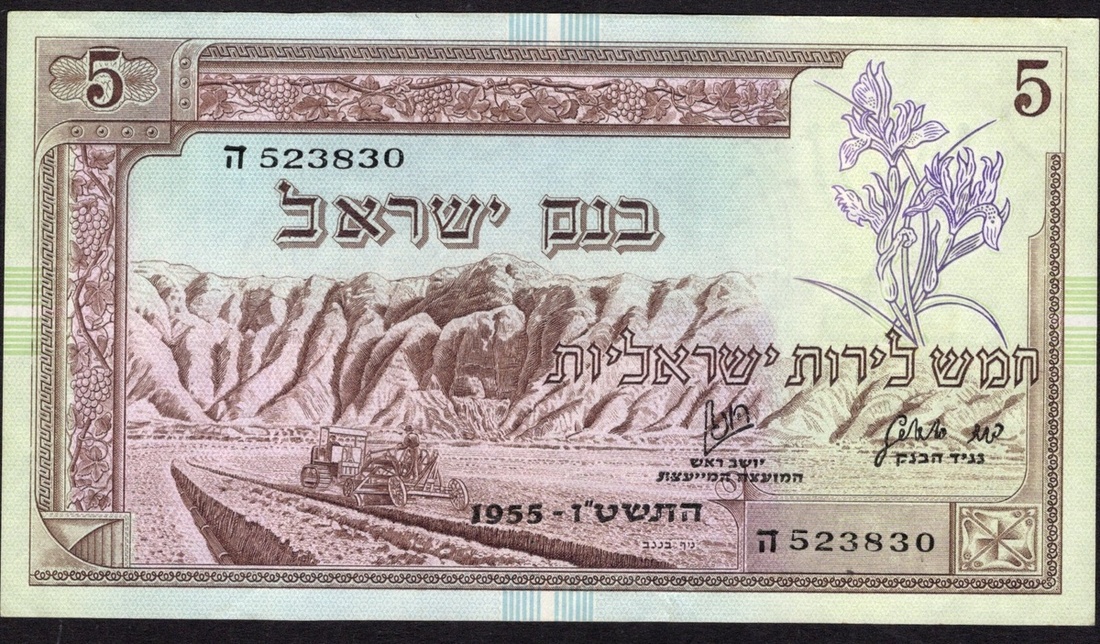 Israel. Bank of Israel. 5 Lirot. 1955. P-26. No. hey 523830. Violet-brown on light blue. Negev landscape, flowers upper right. EF-AU.