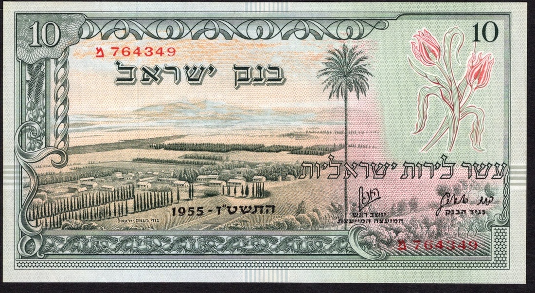 Israel. Bank of Israel. 10 Lirot. 1955. P-27a. Red serial no. mem 764349. Dark green on multicolor. Plain of Jezreel landscape, flowers upper right. Choice Uncirculated.