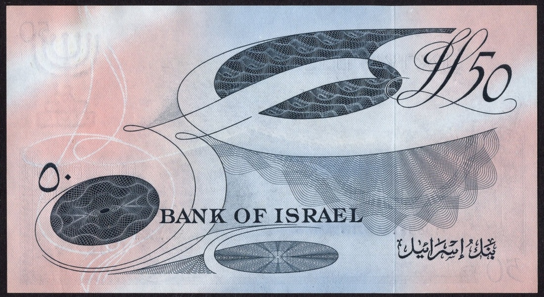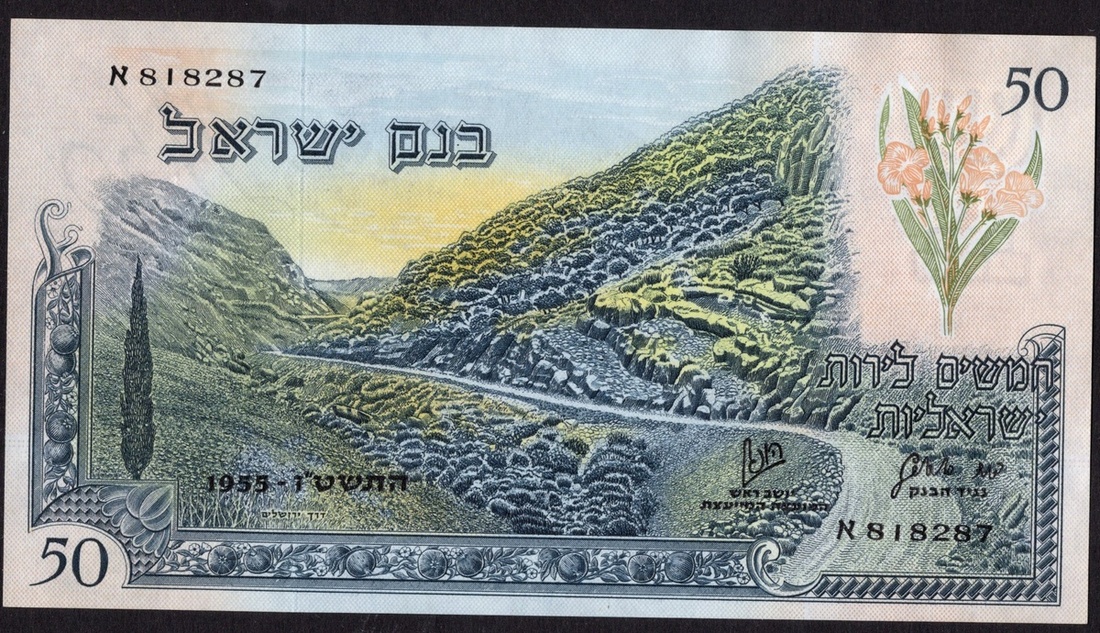 Israel. Bank of Israel. 50 Lirot. 1955. P-28a. Black serial No. alef 818287. Dark blue and multicolor. Jerusalem road between mountains, flowers upper right. AU.
