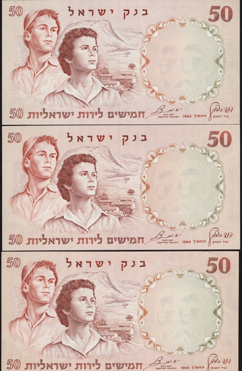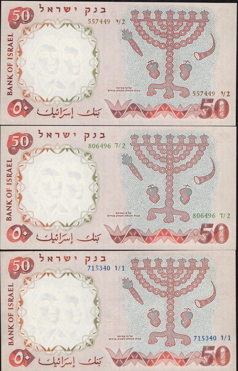 Israel. Bank of Israel. Variety trio of 50 Lirot. 1960. P-33c, d, e. Blue, green, brown serial numbers. Light brown and multicolor. Teenage boy and girl at left; Mosaic of menorah on back. Crisp Uncirculated. [3]
