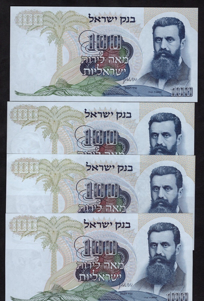 Israel. Bank of Israel. 100 Lirot. 1968. Complete variety set. P-37a, b, c, d. Blue and light green on multicolor. Dr. Herzl at right, palm at left; Menorah and symbols of the twelve tribes of Israel on back. Uncirculated. [4]