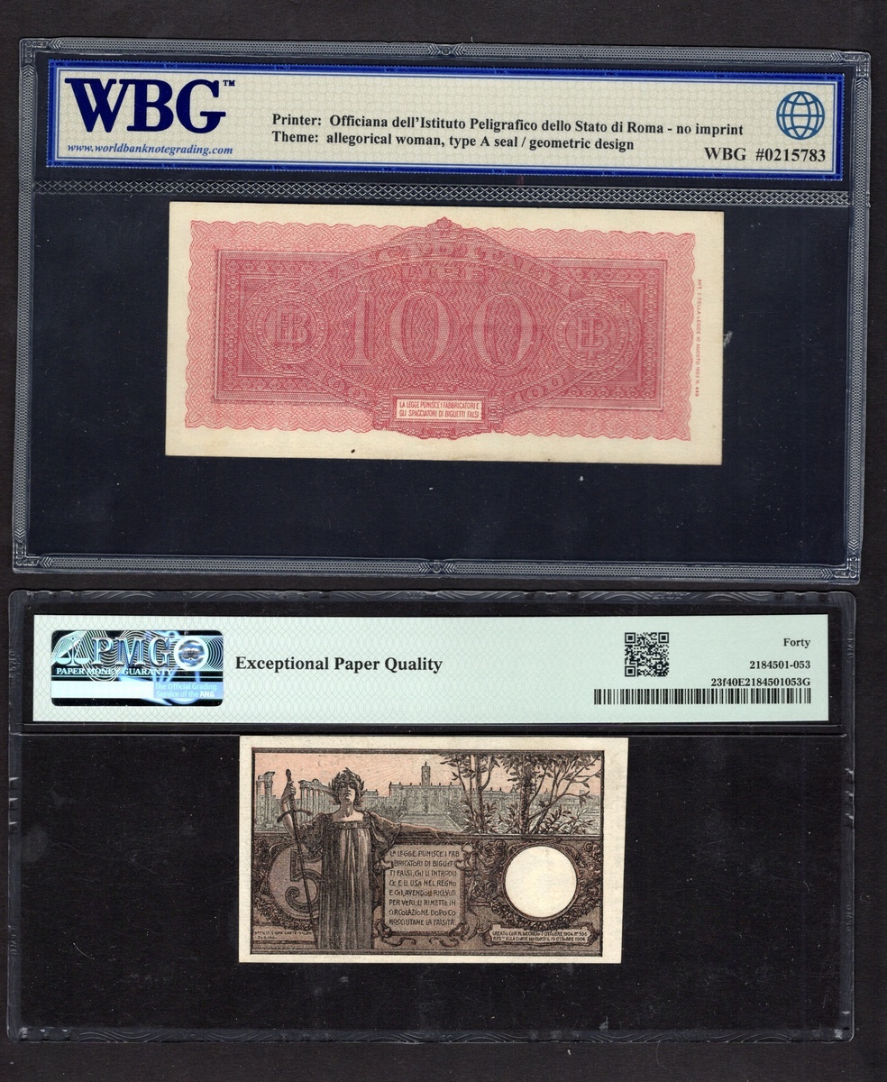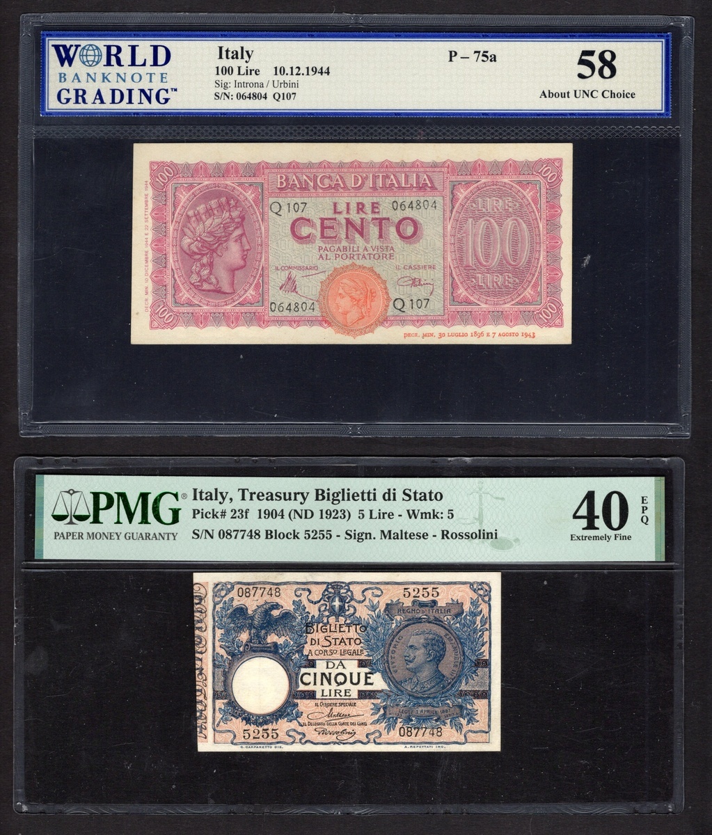 Italy. Pair of Graded Notes. Biglietti di Stato. 5 Lire. 1923. P-23f. Blue, brown on pink. Vittorio Emanuele III at right. PMG Extremely Fine 40 EPQ; Banca d'Italia. 100 Lire. 1944. P-75a. Turreted Italia head at left. WBG About Unc Choice 58. [2]