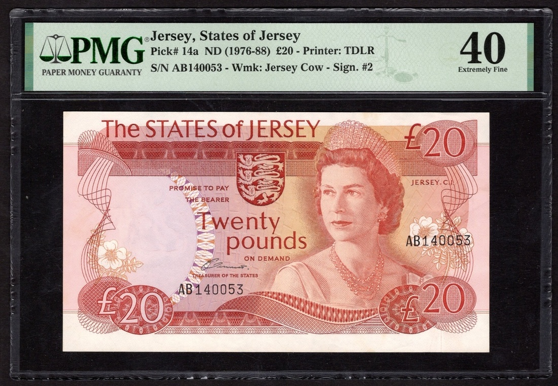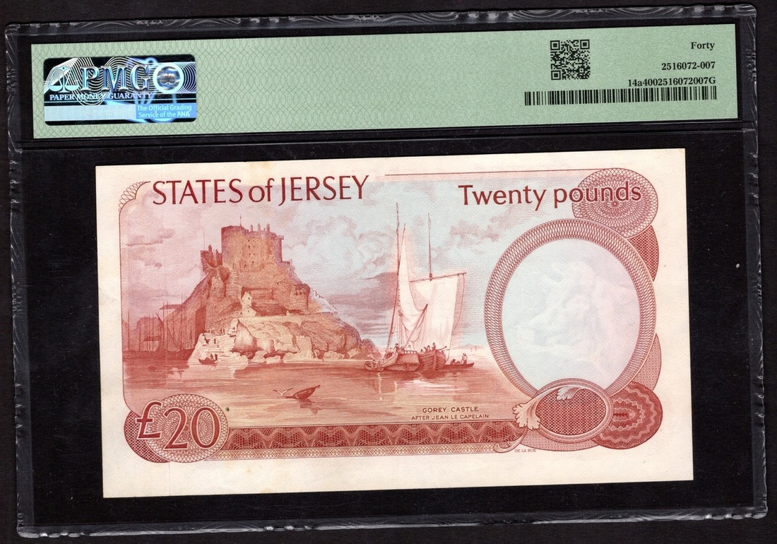 Jersey. States of Jersey. 20 Pounds. ND (1976-1988). P-14a. Red-brown on multicolor. Queen Elizabeth II at right; sailing ships below Gorey castle on back, PMG Extremely Fine 40.